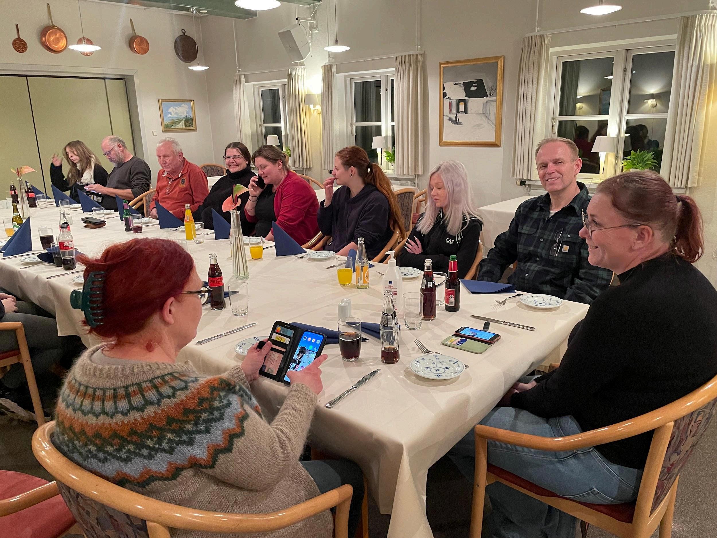 Til aftensmad fik vi lækker oksekød med kartofler, årstidens grøntsager og rødvinssauce Under aftensmaden er der et dejligt sammenhold og det er med til at styrke det sociale i foreningen. Kroen var dog lidt utilfreds med, at der var bestilt aftensmad til to personer, som valgte at tage hjem før aftensmaden uden det var betalt, og derudover at der kom nogle stykker og tilmeldte sig både frokost og aftensmad på dagen