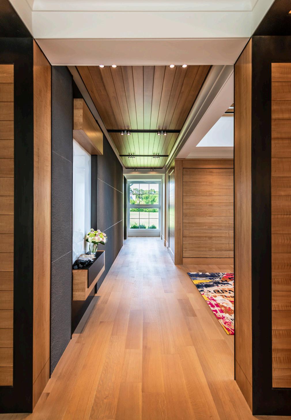 Here, Mojo Stumer employs a careful selection of materials and textures to create a dynamic visual experience. Horizontal wood paneling, complemented by blackened steel detailing, adds depth and contrast, while dark stone slabs lend a sense of solidity. The strategic use of white surfaces introduces brightness and balance, enhancing the interplay of light and shadow. The meticulous attention to spatial dynamics set the Watermill home apart. The ceiling, with its varied heights and intricate detailing, showcases Mojo Stumer’s innovative approach to design. Quarter-cut maple, thoughtfully integrated throughout, mirrors the bespoke rift white oak flooring, establishing a cohesive design language that ties the entire residence together.
