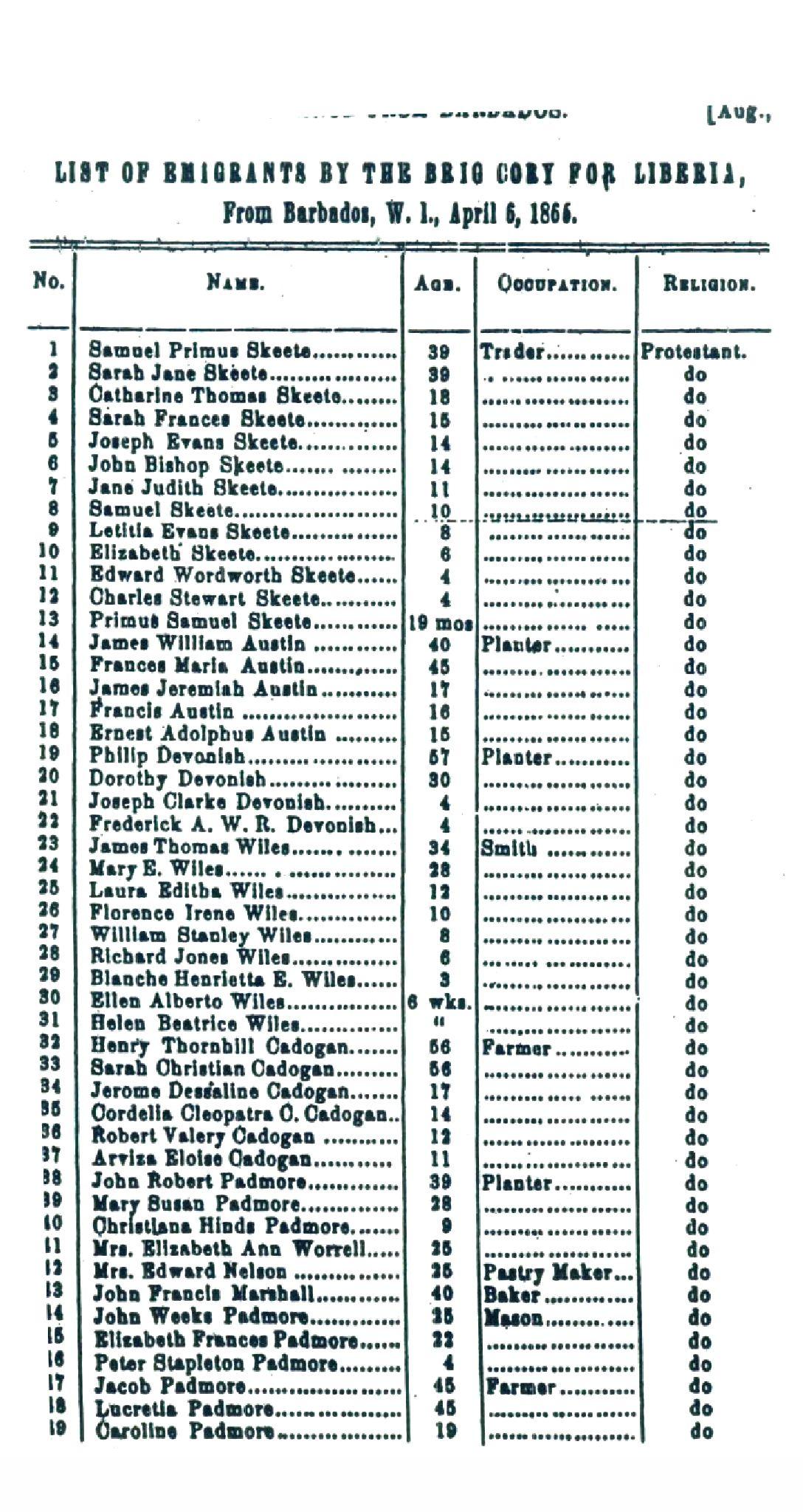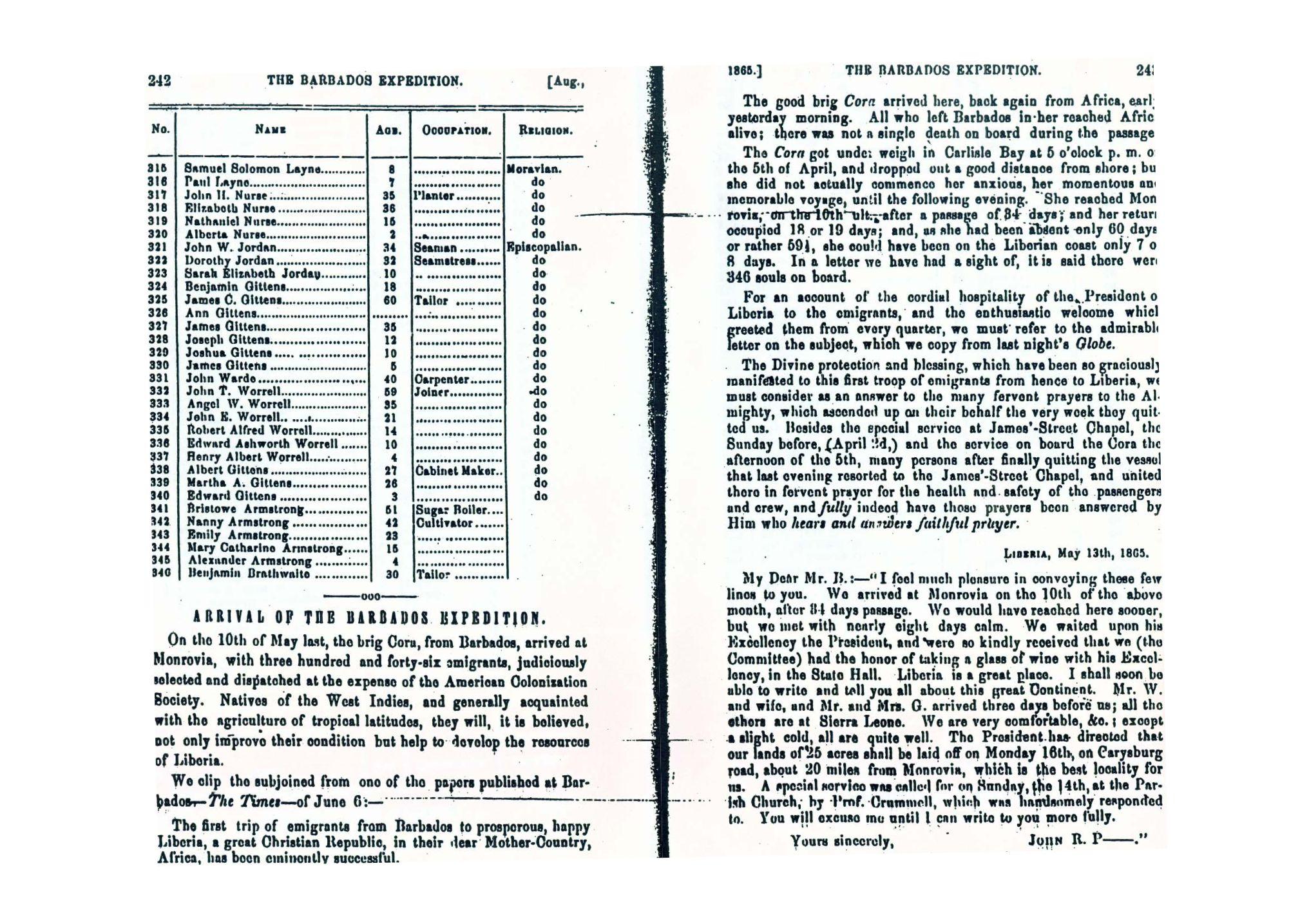 This was the biggest mass migration to Liberia from Barbados at this time as the ship was arranged to take up to 320 passengers since there were only 320 berths onboard; yet at roll call in Bridgetown, 333 persons were on board; but the Captain landed 346 persons at Monrovia; being 26 more than was arranged should go; 26 more than berths had been provided for on board; and 13 more than had answered to their names when called prior to the sailing of the vessel.