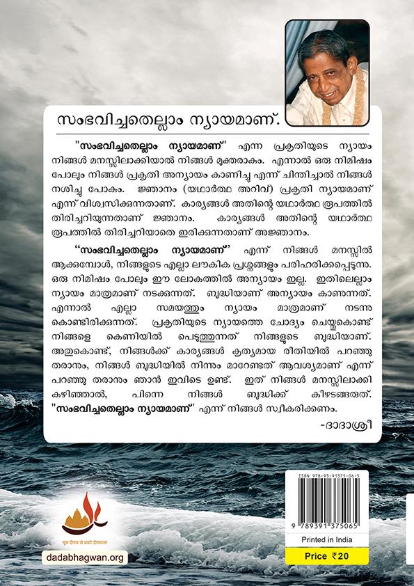 ആമുഖം ഉത്തരേന്ത്യയിലെ ബദേീനാഥിലം രേദാർനാഥിലം ആയിേക്കണക്കിന് തീർത്ഥാടേർ തീർത്ഥാടനത്തിൊയിരുന്നു; ലെലെന്ന്ഒരുഹിമൊതംഇടിമിന്നരെറ്റ്നൂറുേണക്കിന്ആളുേലെ കുഴിച്ചുമൂടി. ഇത്തേലമാരു വാർത്ത രേെരതാലട എല്ലാവരും നിോശോയി. അവർ ര ാദിക്കുന്നു, "തീർത്ഥാടേർ വെലേ ഭക്തിരയാലടയം വിശവാസരത്താലടയം ദദവലത്ത ആോധിക്കാൻ പുറലെട്ടു, െിലന്ന എന്ത്ിനാണ് ഈ ആളുേലെ ദദവം ഇങ്ങലന ലോല്ലുന്നത്? ദദവംഭയങ്കേഅനീതിയാണ്ോണിക്കുന്നത് !" േണ്ട് സരഹാദേന്മാർക്കിടയിൽഅനന്ത്ോവോശംവിഭജിക്കുരപാൾ, ഒരു സരഹാദേൻ എല്ലാം ഏലറ്റടുക്കുന്നു, മരറ്റ സരഹാദേന് കുറഞ്ഞ വിഹിതം െഭിക്കുന്നു. ഇരൊൾ അത്തേലമാരു സാഹ േയത്തിൽ, ബുദ്ധി നീതി രതടുന്നു, അവസാന ആശ്രയലമന്ന നിെയിൽ, നിയമ രോടതിേെിൽനിന്ന്സഹായംരതടി, രൊോെംസുപ്ീംരോടതി വലേതുടരുന്നു. തൽഫെമായി, അവർഅസന്തുഷ്ടരുംദുഖിതരുമായി തുടരുന്നു. ഒരുനിേെോധിജയിെിൽേഴിയരപാൾ, കുറ്റവാെിപുറത്ത് ജീവിതം ആസവദിക്കുരപാൾ, ഇതിൽ എവിലടയാണ് നീതി? ധാർമ്മിേോയ ആളുേൾ അസന്തുഷ്ടോകുരപാൾ, അധാർമ്മിേോയ ആളുേൾ ബംഗ്ലാവുേൾ നിർമ്മിക്കുേയം ോറുേെിൽ േറങ്ങുേയം ല യ്യുരപാൾ; ഇത് നീതിയാലണന്ന് ഒോൾക്ക് എങ്ങലന േണക്കാക്കാനാകും? നമ്മുലട ജീവിതത്തിലെ ഓരോ ഘെത്തിലം ഇത്തേം സംഭവങ്ങൾസംഭവിച്ചുലോരണ്ടയിേിക്കുന്നു, അവിലടബുദ്ധിനീതി രതടാൻ പുറലെടുന്നു. തൽഫെമായി, ഞങ്ങൾ കൂടുതൽ കൂടുതൽ ദുേിതമനുഭവിക്കുന്നു! തിേച്ചും ആദേണീയനായ ദാദാശ്രീയലട അസാധാേണമായഒരുആത്മീയേലണ്ടത്തൊണ്,'ഈരൊേത്ത് ഒേിടത്തം ഒരു അനീതിയം സംഭവിക്കുന്നില്ല.' എന്തു സംഭവിച്ചാലം അത് നീതിയാണ്! പ്കൃതി ഒേിക്കലം നീതിയലട മണ്ഡെത്തിന് പുറത്ത് േടന്നിെില്ല. ോേണം, പ്കൃതി ഒരു വയക്തിയല്ല, അത്