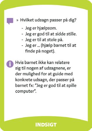 Når den voksne har læst kortet op, og barnet har løst eller svaret på opgaven efter bedste evne, er det næste barns tur.