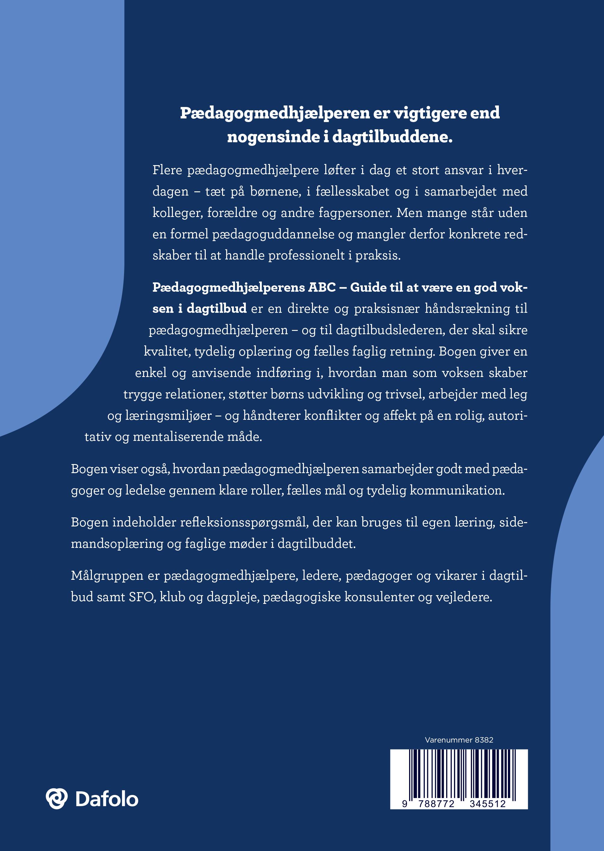 Titlen på bogen afslører, at den primære målgruppe er pædagogmedhjælperen i dagtilbud, hvad enten pædagogmedhjælperen er helt nyansat eller mere erfaren i faget. Pædagogiske assistenter, vikarer og pædagoger kan bruge bogen som en faglig brush-up og en måde at danne sig et overblik over centrale begreber og områder. Bogen er også relevant for pædagogmedhjælperens leder9, hendes vejleder/mentor og samarbejdende pædagogkollega på stuen og ressourcepædagogen med en særlig funktion. Når det ikke kun er pædagogmedhjælperen, men også pædagogmedhjælperens leder og kolleger, der læser bogen, giver det mulighed for at drøfte bogens temaer, eksempler, begreber og spørgsmål og derigennem opnå en fælles viden og forståelse. Også dagplejere, SFO- og klubpædagoger kan profitere af at læse bogen. Trods de forskellige arbejdsområder og den til dels ældre målgruppe (SFO og klub) er der en stor faglig fællesmængde for pædagogmedhjælperne. Et langt stykke hen ad vejen er det de samme kompetencer, der er nødvendige at besidde for at kunne lykkes med målgruppen, uanset hvor børnene befinder sig.