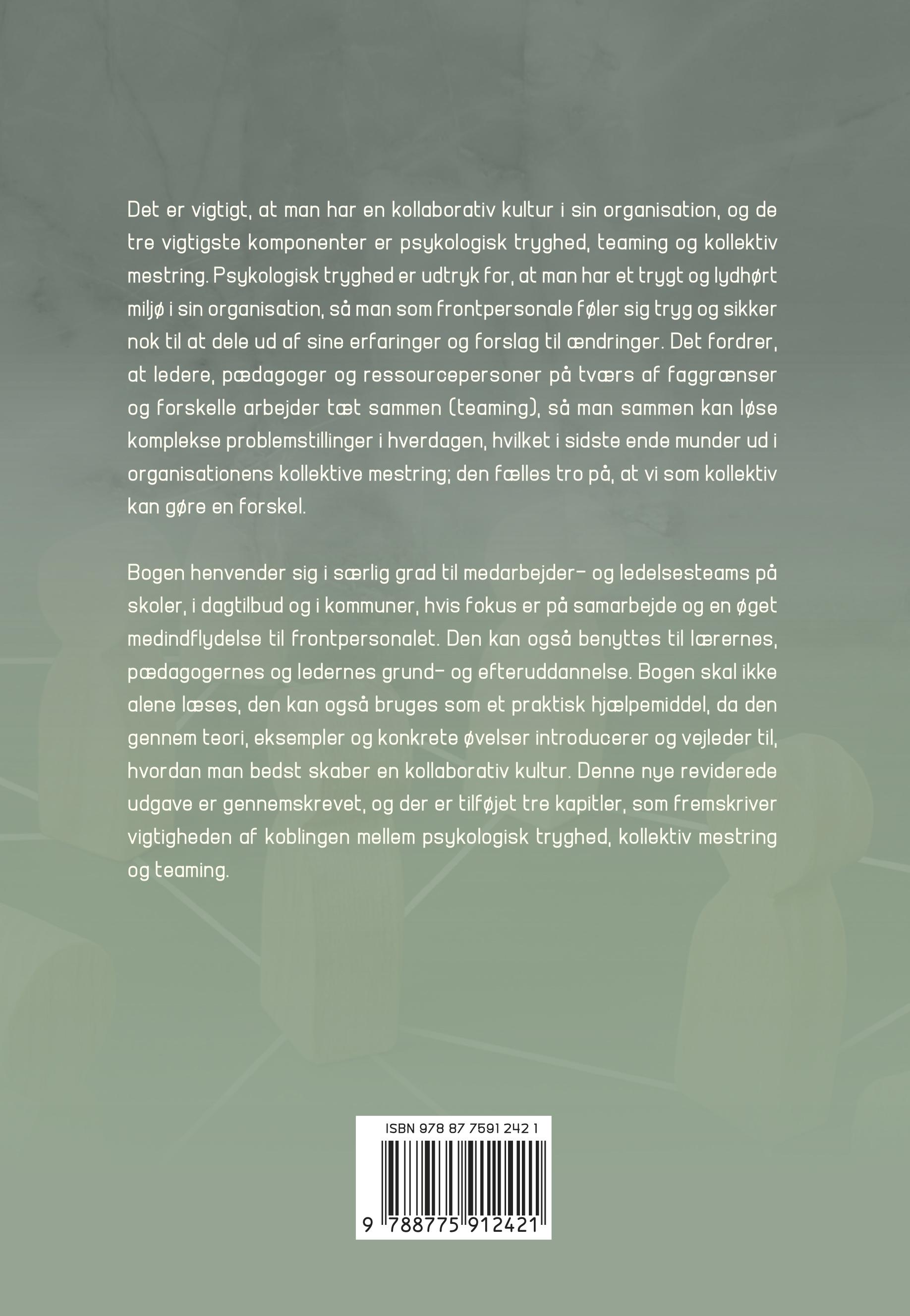 Denne bog skal ses som et næste skridt, man kan tage i forlængelse af professionelle læringsfællesskaber, og bogens fokus er på at skabe kollaborativ kultur igennem kollektiv mestring, psykologisk tryghed og lydhør, målrettet ledelse.
