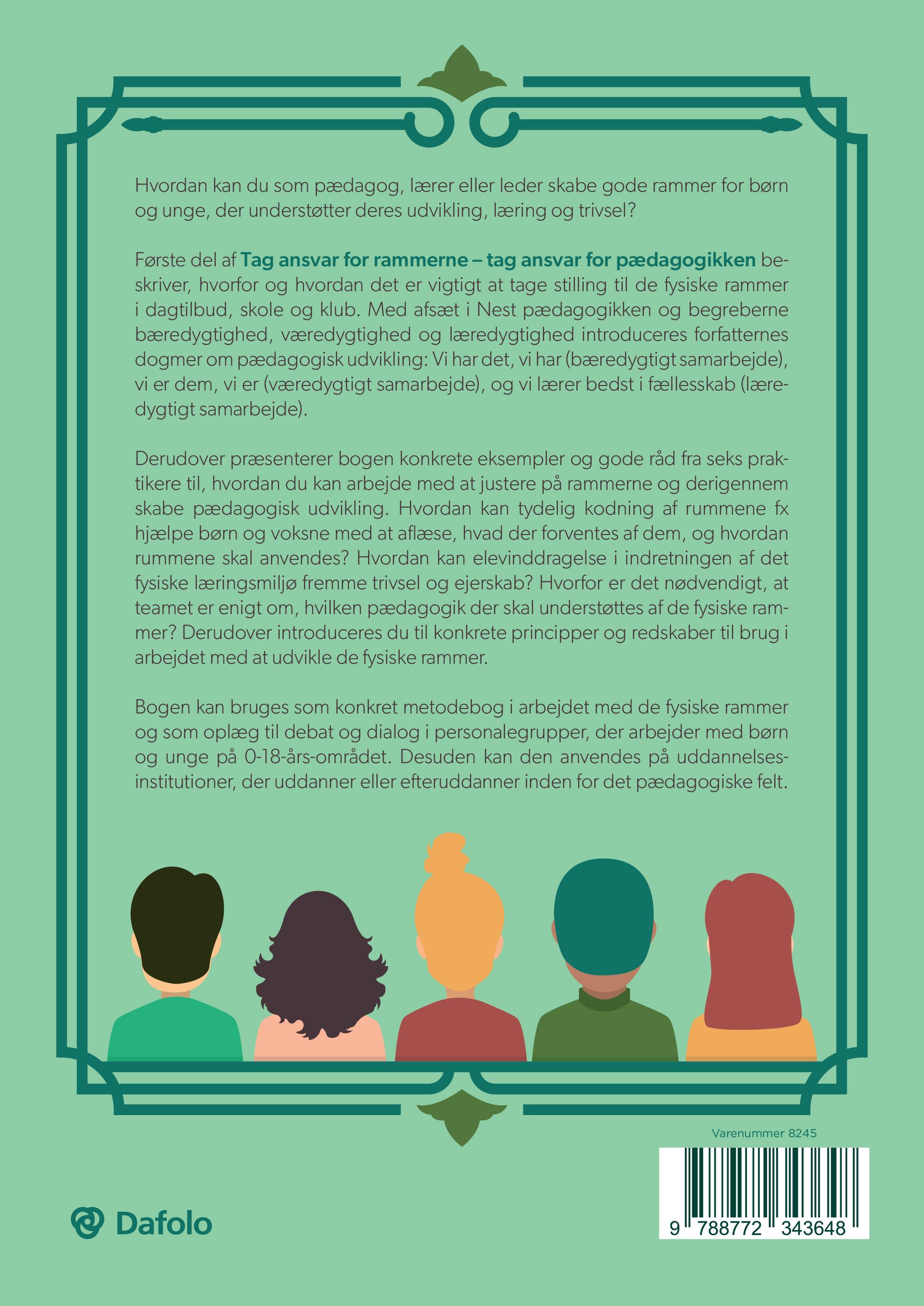 I bogen har vi fokus på, hvordan man kan tage ansvar for rammerne og dermed for pædagogikken. Vi forholder os til samarbejdet omkring de fysiske rammer, da det er helt essentielt, at der er et fælles fagligt fokus, fælles prioritering og en fælles indsats. Med respekt for og vel vidende, at samarbejde også er en medierende proces, da der selvsagt altid vil være mange og også forskellige ønsker og behov. Vi forstår de fysiske rammer som afgørende for kvaliteten af det faglige, det emotionelle og det sociale fællesskab. Vi bedømmer ikke, hvad der er rigtigt og forkert, pænt og grimt. For os handler det om at tage bevidst stilling til det, der er, at intet er for småt at forholde sig til og at have et kontinuerligt og specifikt fokus på, hvordan rammerne bedst muligt kan understøtte læringen og trivslen for fællesskabet og for den enkelte.