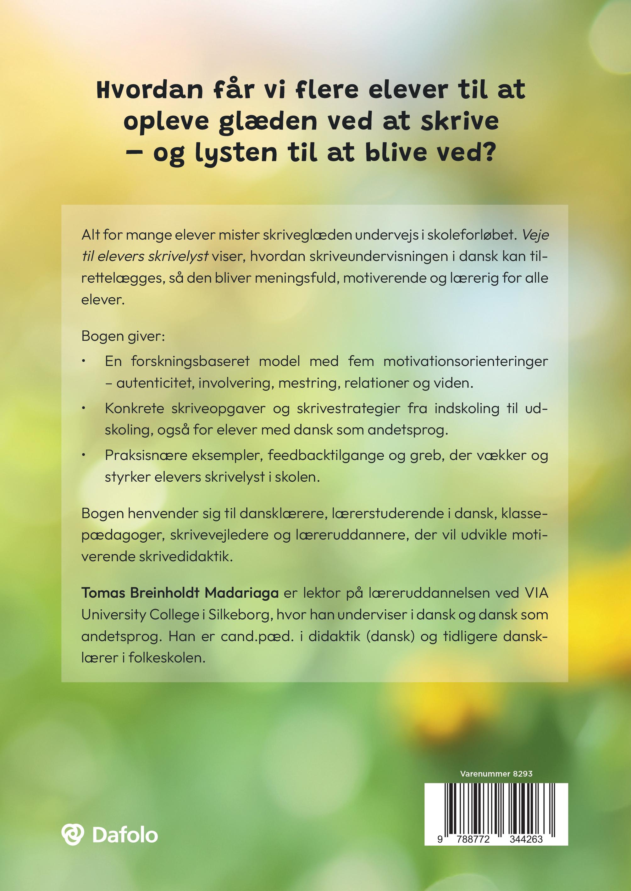 Selvom undervisningskontekster ofte er præget af mange pædagogiske hensyn, og elevernes behov er forskellige, er det bogens hensigt at vise nogle af de veje, du som underviser kan gå for at styrke dine elevers skrivelyst.