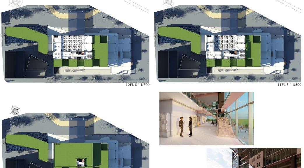 國際企業 (私領域) 交流接待 展售(公眾) 企業辦公、 會議室、總 部 交誼、展售、 商場、演講 停車空間 創業育成 (半公眾) 工作室、辦 公室、媒合 會議室 1F ~ 3F 4F ~ 5F A 款 6F~7F B款 8F~9F 國際 會議 10F~ 11F 分層分區計畫 汽車、機車 B1~B2 • 設計資訊 : • 設計建築覆蓋面積 : 4514 m2 • 設計 樓地板面積: 22630 m2