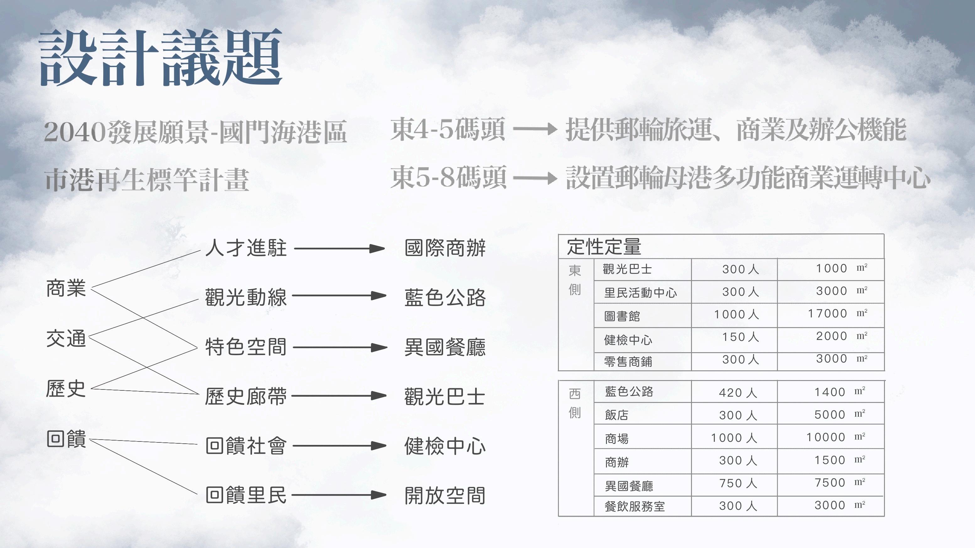 目錄 港城丘嶼_基隆市郵輪港設計 01 綜合商辦總部 /郵商玩水_ 基隆市 威海營區再生設計 02 期中小組合作 期末個人展現