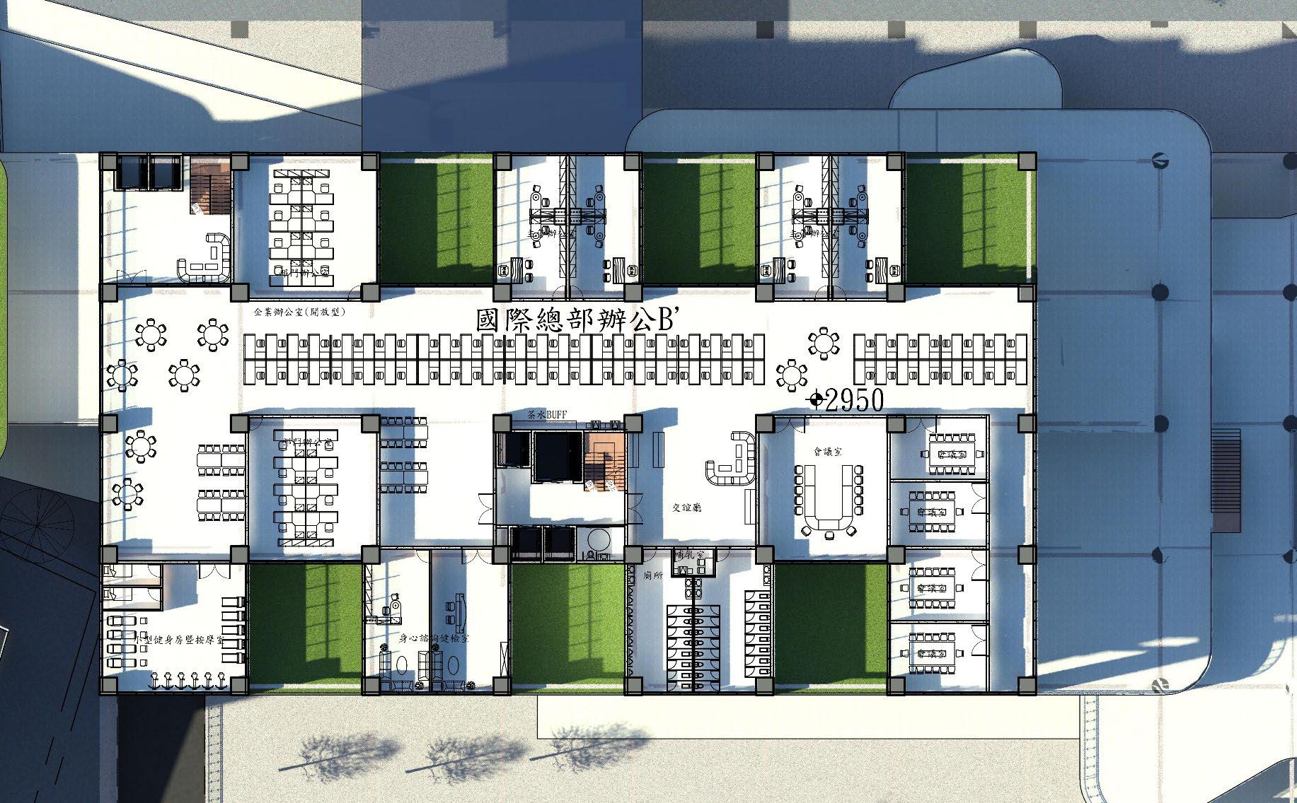 項次 性質 空間名稱 空間數量 容納服務人 數 面積小計 (坪) 備註 國際辦公總 部 企業辦公室(獨立型) 26 26*10=260 350 企業辦公室(開放型) 4 4*30=120 150 會客 8 8*10=80 100 國際會議室 1 300 500 會議室 14 14*20=280 350 開放討論室 14 14*20=280 350 多功能活動室暨演講放映廳 7 7*50=350 500 小型健身房暨按摩室 2 2*30=60 120 遊戲室暨休息室 2 2*30=60 120 身心諮詢健檢室 2 2*15=30 120 其他 茶水間、廁所、哺乳室、倉 儲