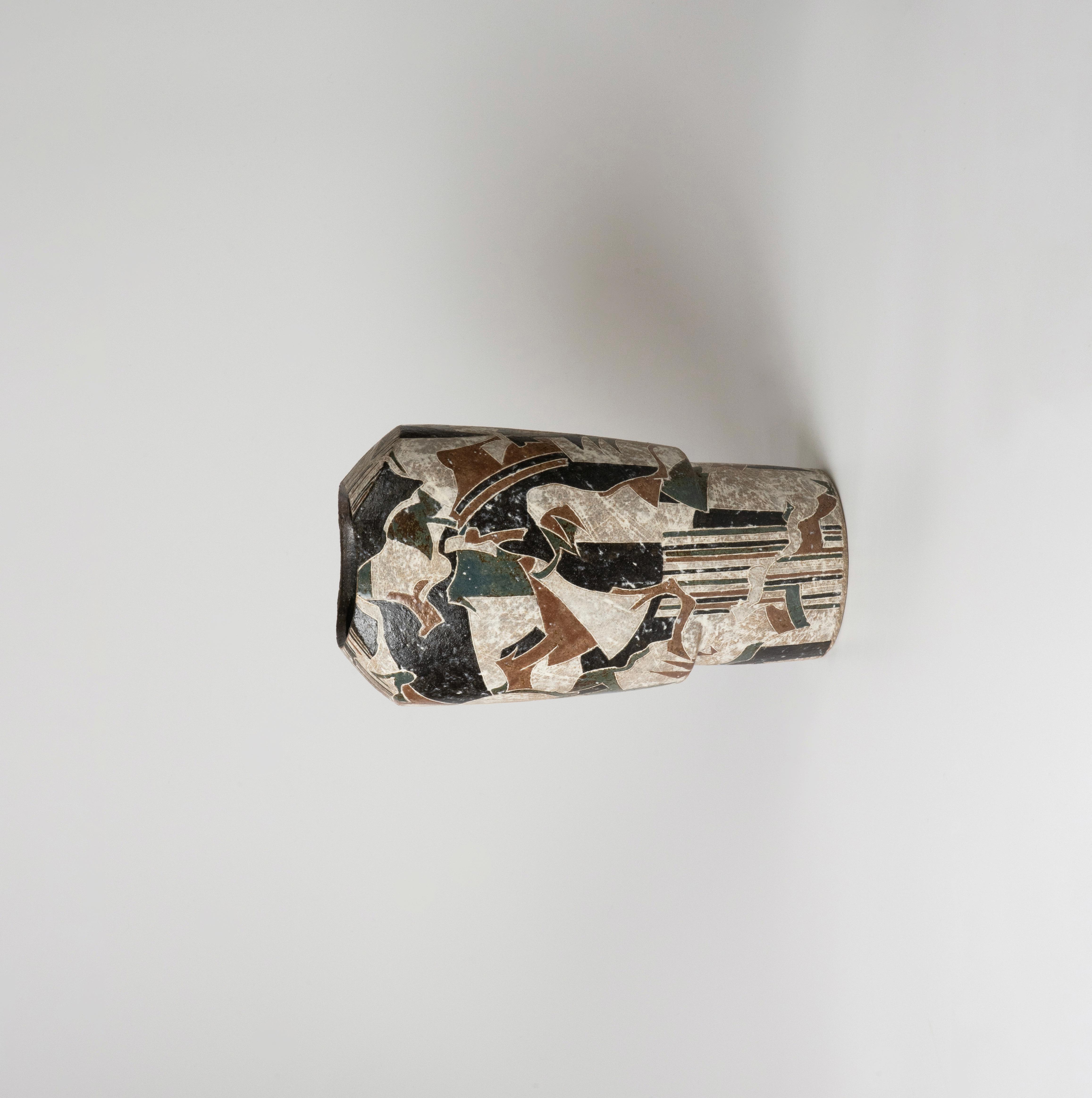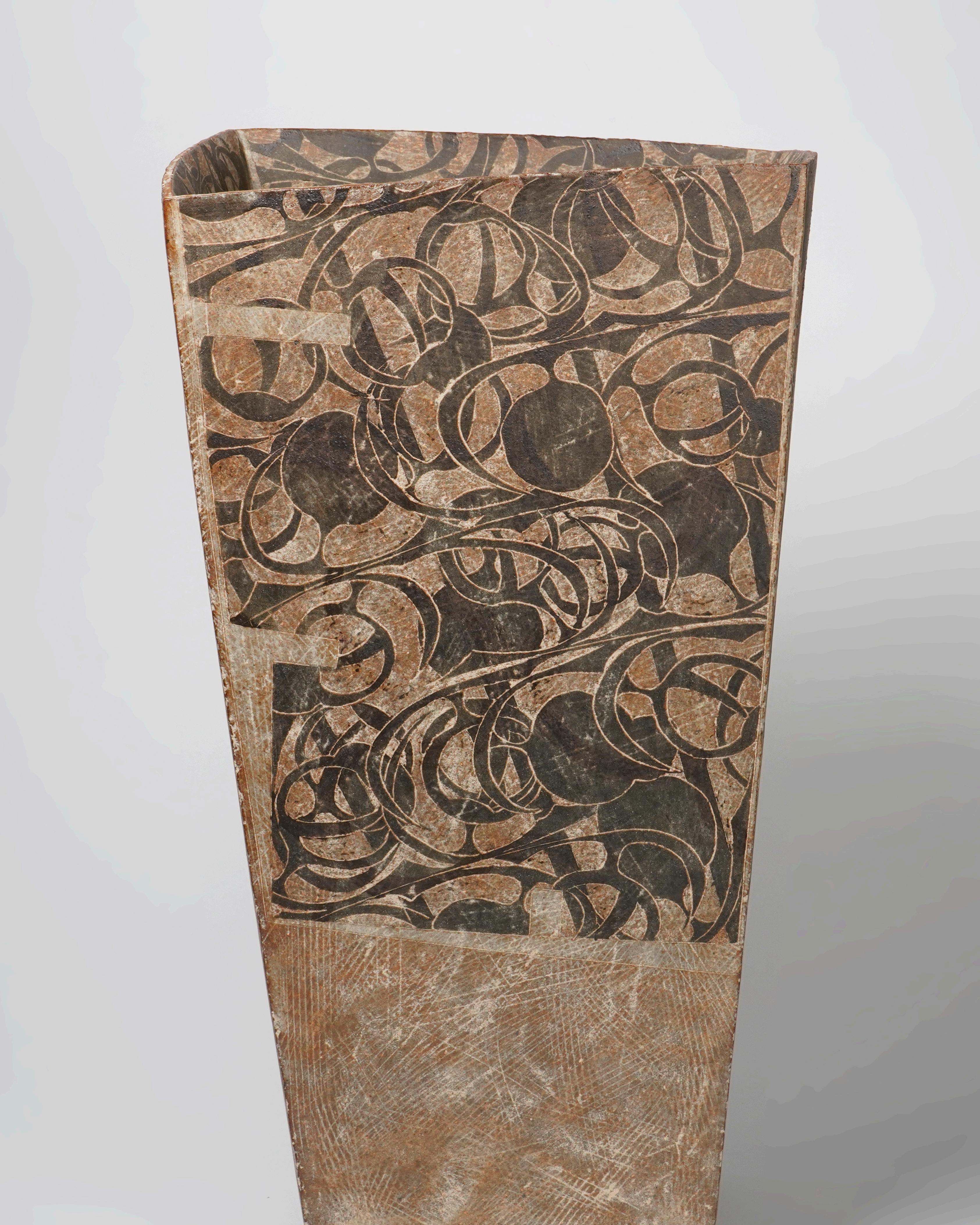 釉をロウで蓋いながら施け別けてゆく⽅法を釉彩と名づけて使い出し たが、 そこに描き出してゆく形を、 まだ幼かった息⼦が 「⿃のよう だ」 と⾔った⾔葉で⿃のイメージを持たせた数種のパターンが順次⽣ まれて来て、 それらをまとめて⿃⽂ということにした。⿃⽂を⾊々⼿ がけているうちに、⽩化粧の上に透明釉と黒釉を⼤きく施け別け、その 両者を⾊釉の縞をまとった模様がつなぐという、これまでとは少し違 った⽅法が⽣まれて来た。