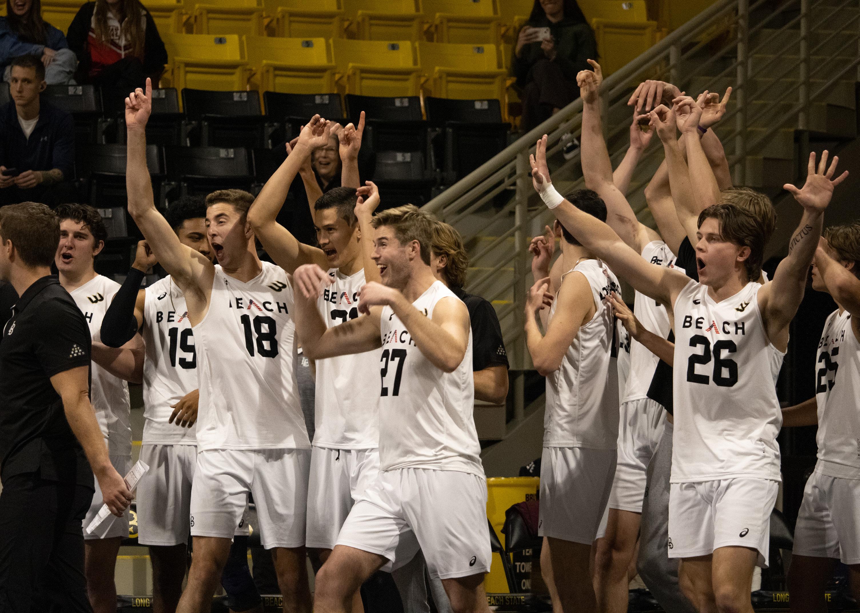 The LBSU men’s volleyball team celebrates after securing the win against Loyola Chicago.