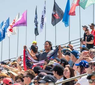 Clockwise from the top: Connor Bloum passes through turn 10 during the first round of the 2026 Porche Carrera Cup North America. Bloum placed fifth on April 18 at the 2026 Grand Prix in Long Beach. | Fans near turn 1 cheered from the stands as the Weathertech SportsCar Champions started on April 18. The No. 93 Grand Touring Prototype (GTP) of Acura Meyer Shank won the title of champion. | Alex Palou (center) celebrates his win at the Victory Lane at the Grand Prix in Long Beach after completing the final lap of the NTT IndyCar Series. Felix Rosenqvist (left) placed second and Scott Dixon (right) placed third.