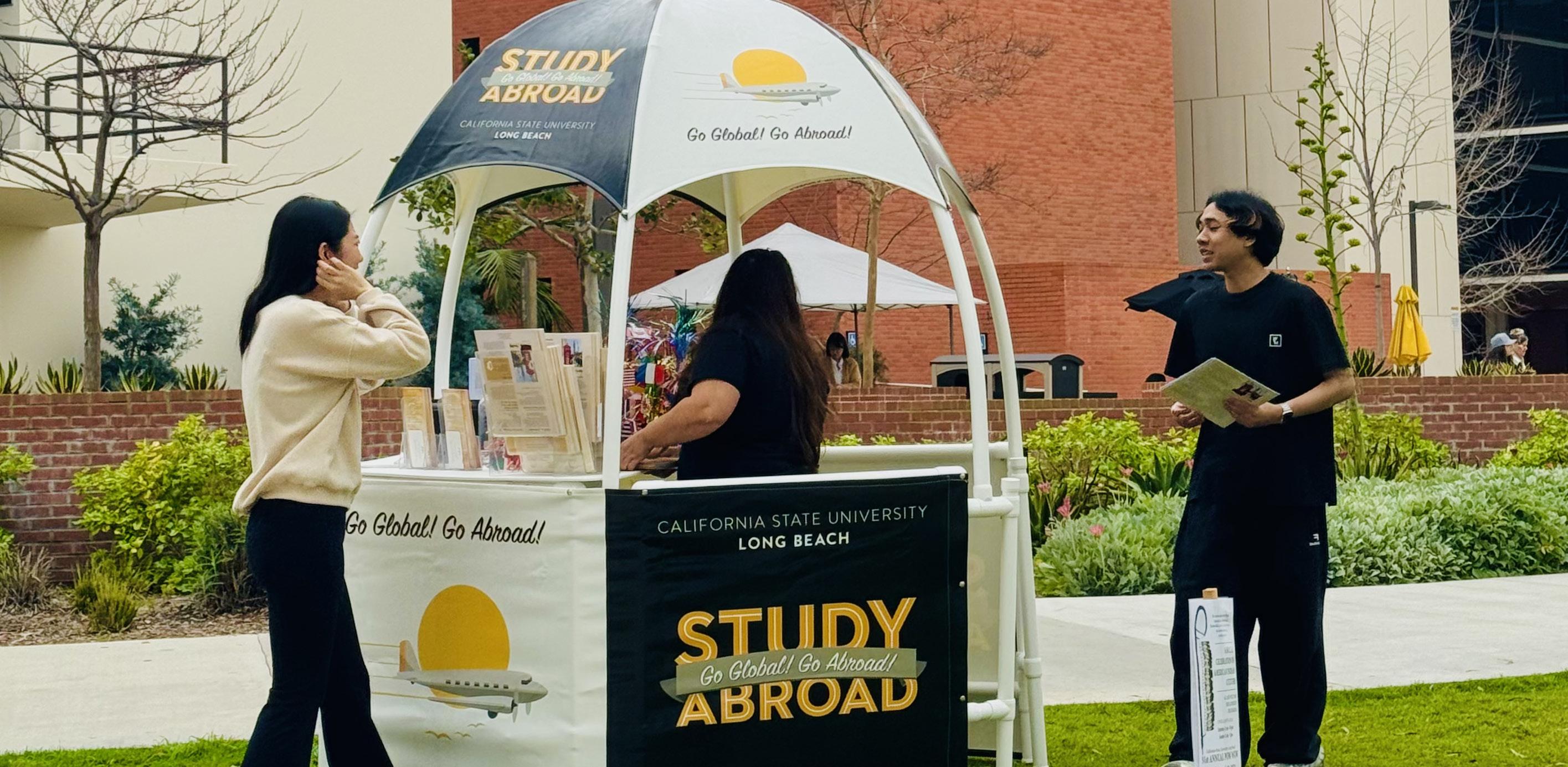 Students run a study abroad information tent on the CSULB campus. Students interested in studying abroad can visit Foundation Building Suite 230 for information on the programs offered.