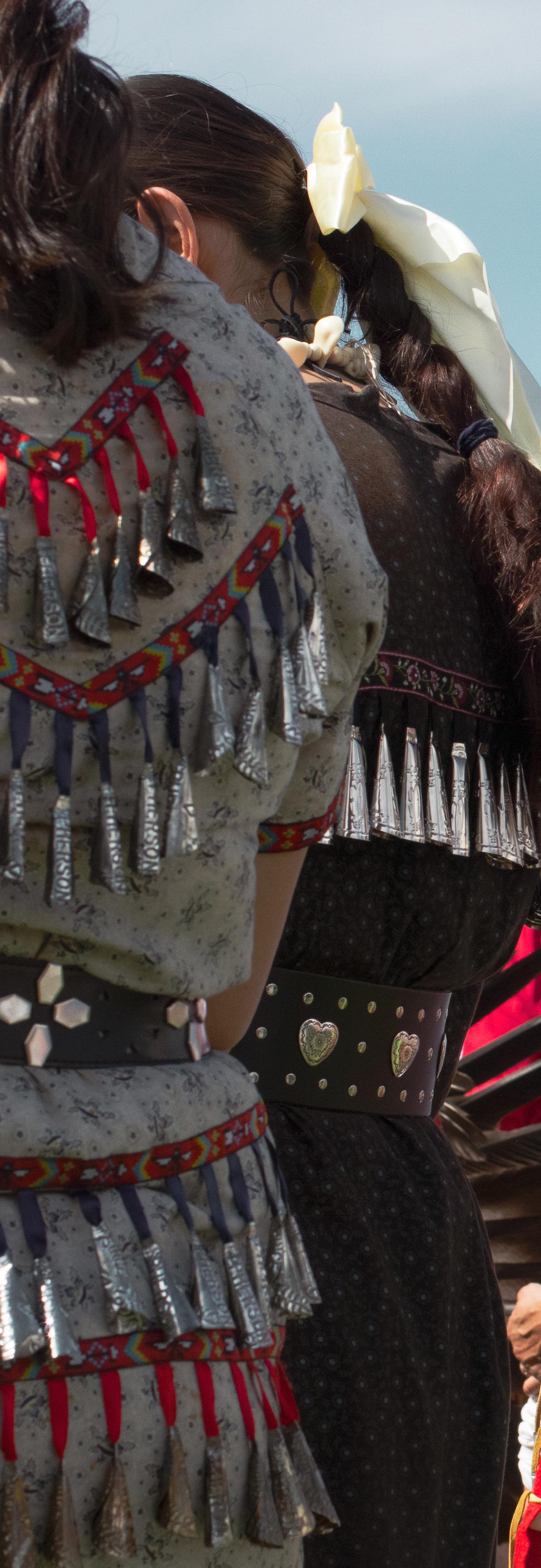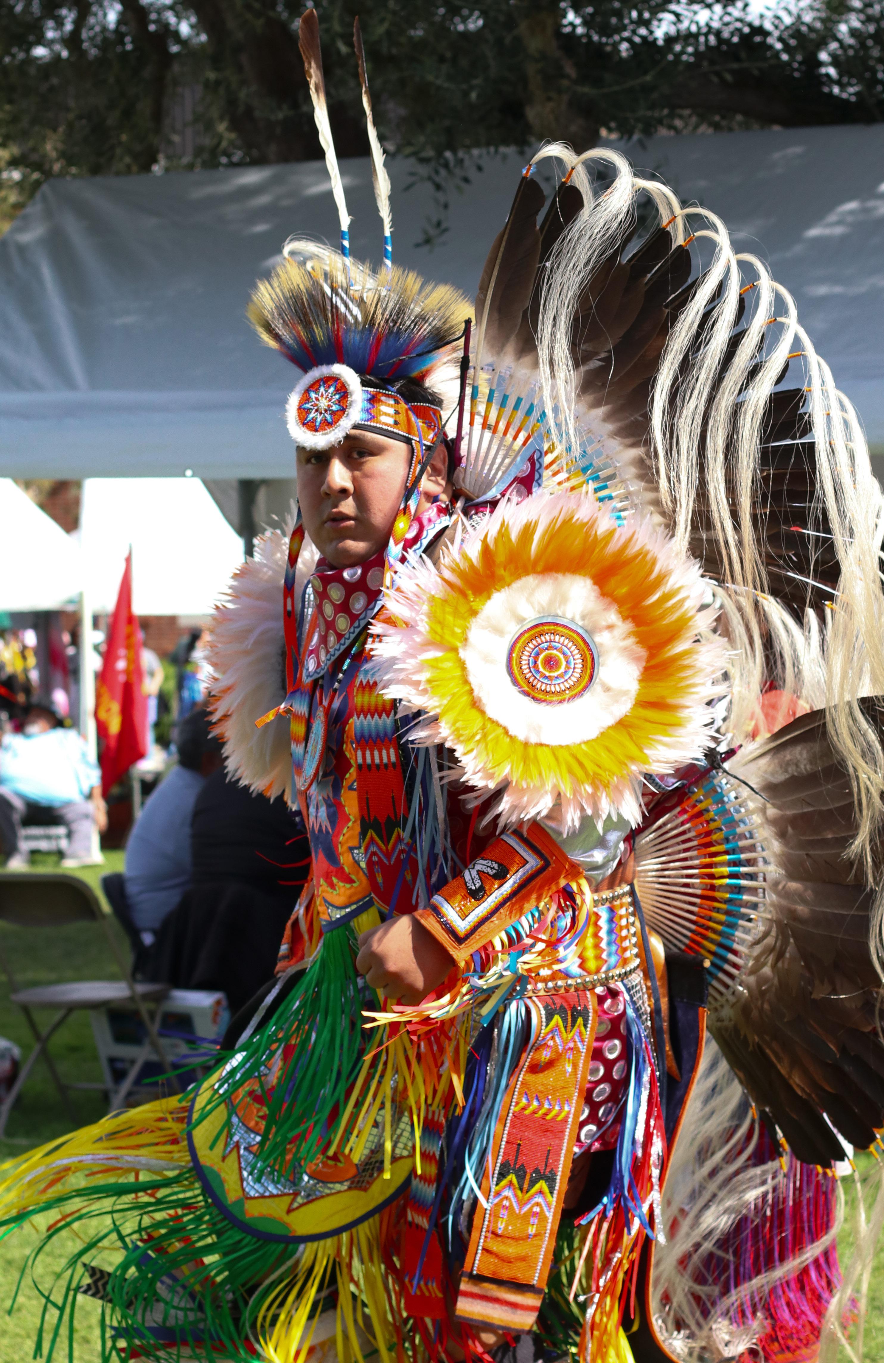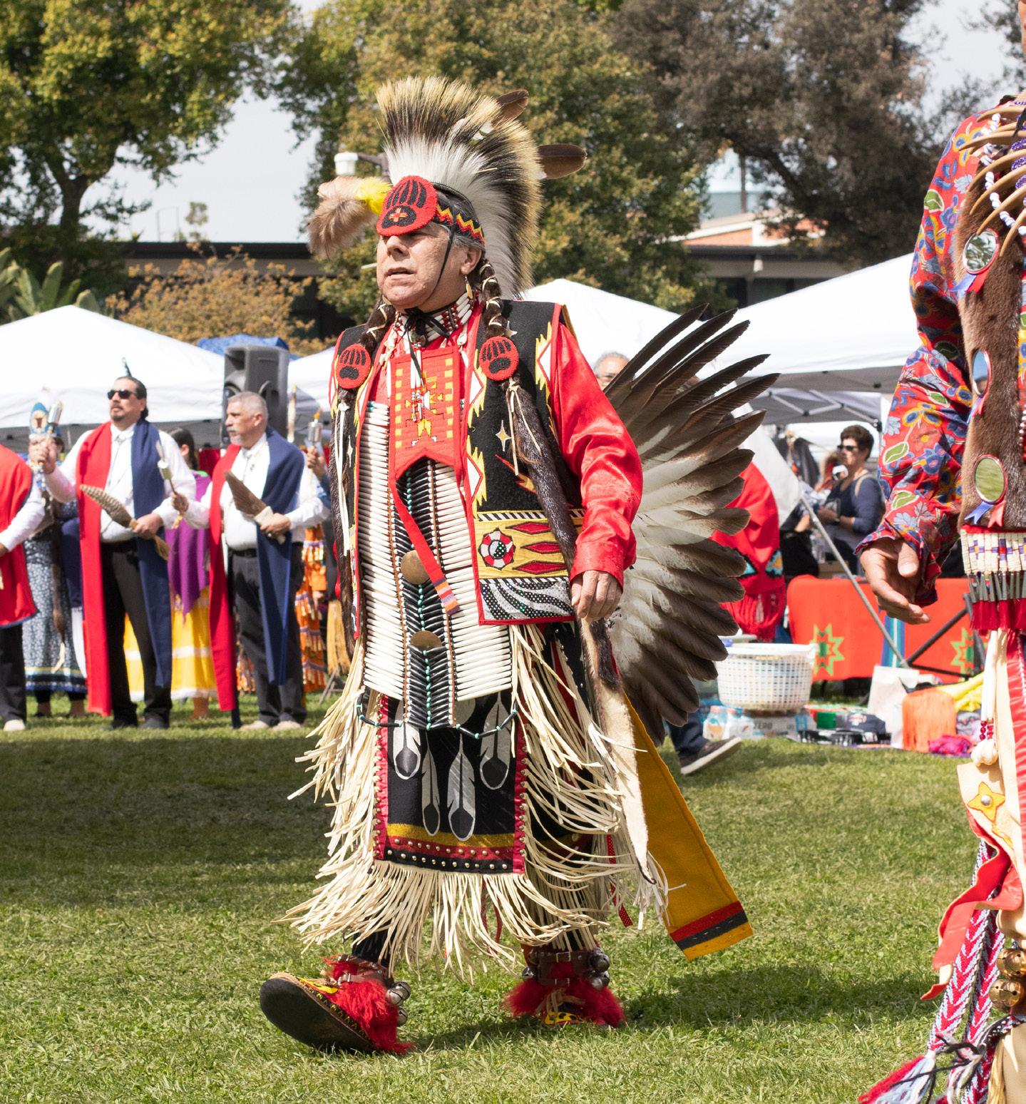 A Grand Entry dancer, adorned in traditional Native apparel, parades with others, following the Eagle Staff. The staff is a symbol of Indigenous sovereignty.