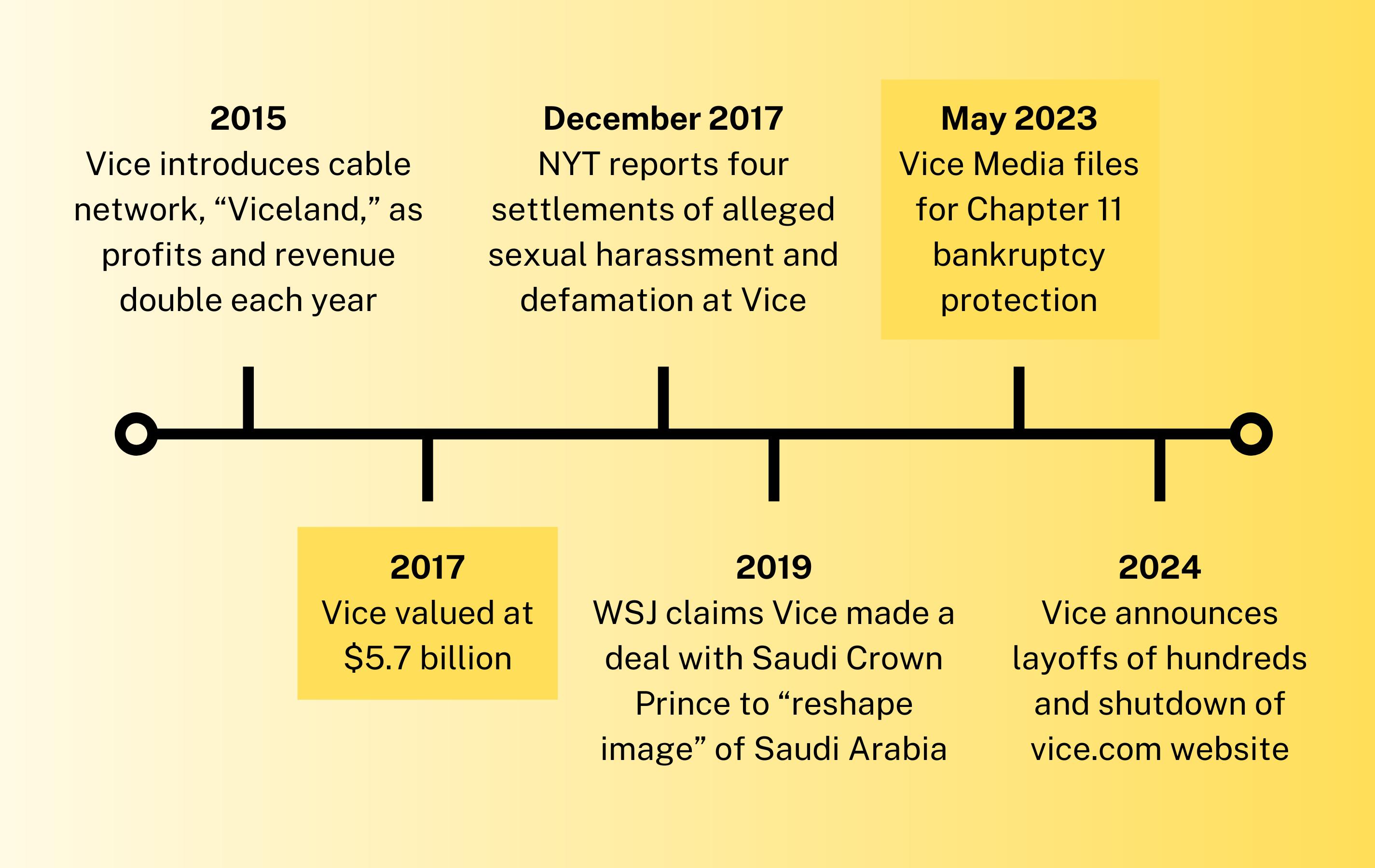 Over the last several years, Vice Media has gone from being a multi-billion-dollar company to experiencing bankruptcy and significant cuts and layoffs. Unless otherwise stated, the included information is from Associated Press News.