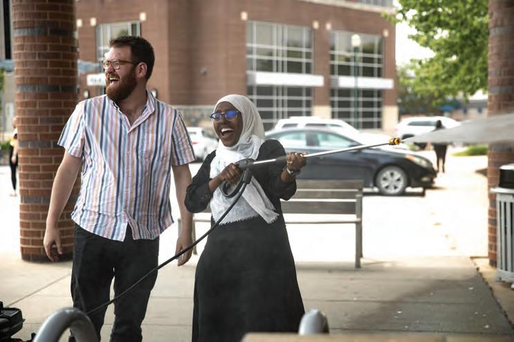 Geoff Stellfox/The Gazette Artist Isaac Campbell teaches library community resources navigator Samira Abdalla how to power wash off murals on May 25, 2023, at the Coralville public library in Coralville, Iowa.