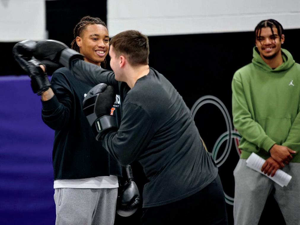 Jaylan Bradberry ’26, a kinesiology major, and Nate Jacobson ’27, a physical education major, worked together with two others to present about boxing. The two Cornell basketball players demonstrated hits that were acceptable back in time and even showed how athletes would wrap their hands for a match.