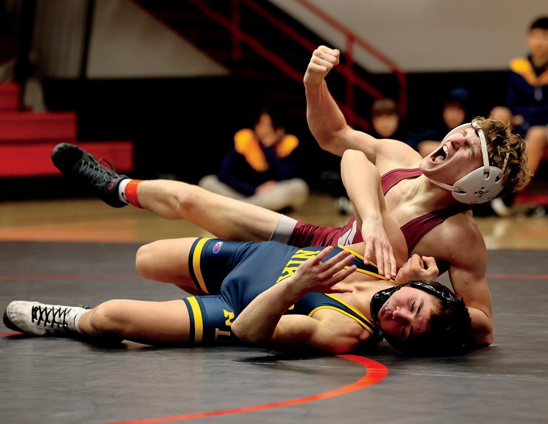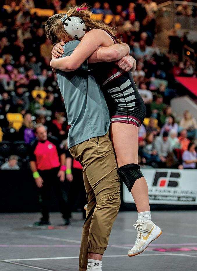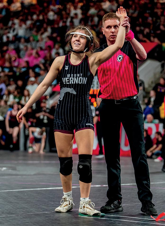 Left: Mount Vernon’s Grace Pinckney begins to celebrate after winning by a fall during the state tournament. Pickney placed fifth in the 170-pound weight class.