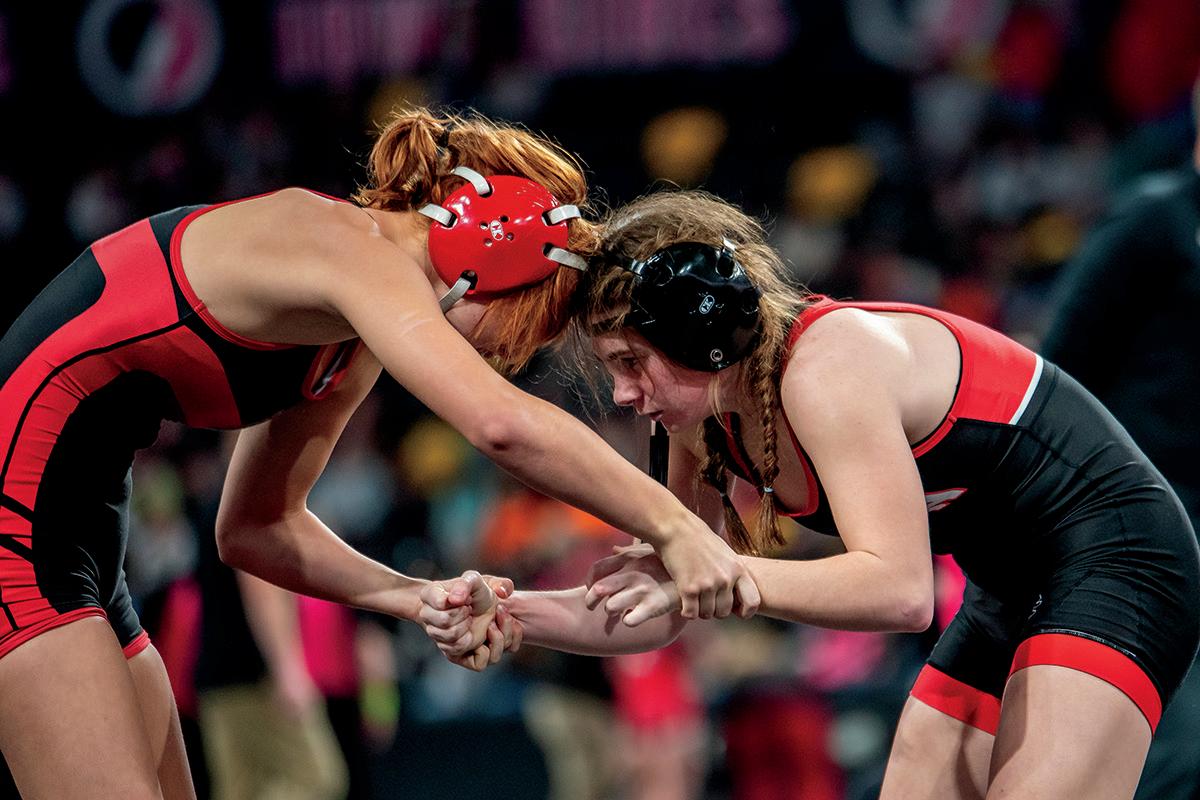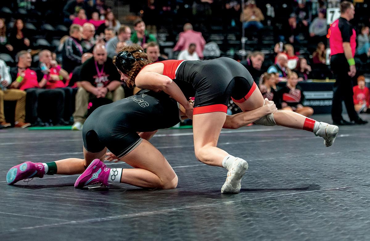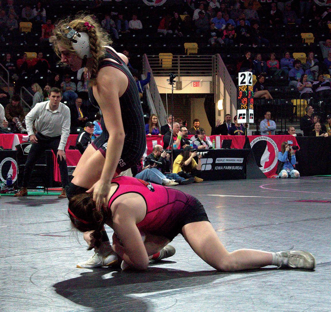 Bottom left: Mount Vernon’s Addy Whisner pushes an opponent down to the mat at the girls’ state wrestling tournament in Coralville.