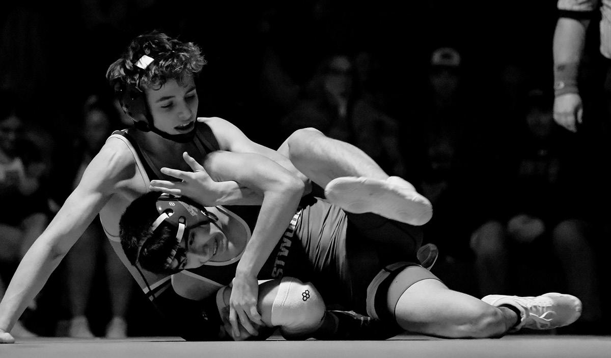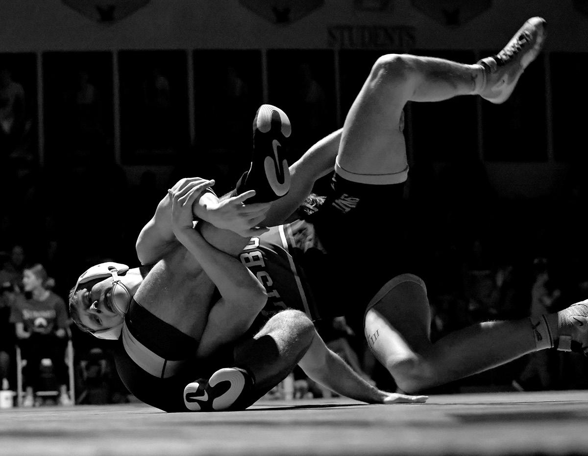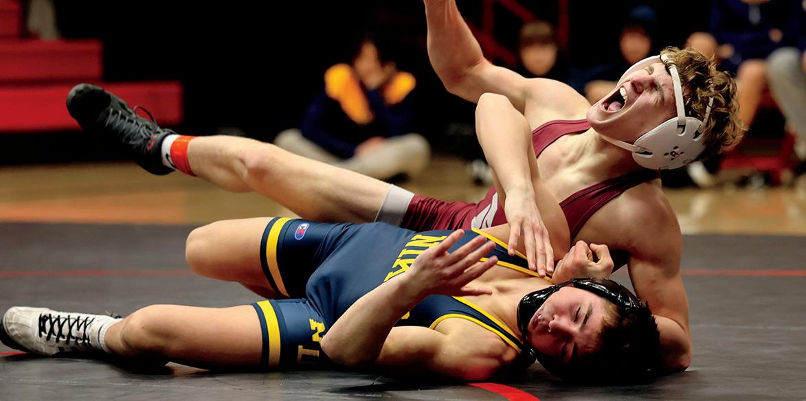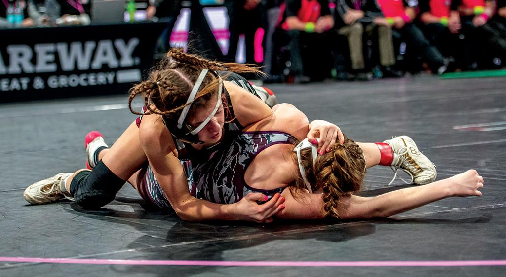 Bottom left: Mount Vernon’s Addy Whisner pushes an opponent down to the mat at the girls’ state wrestling tournament in Coralville.