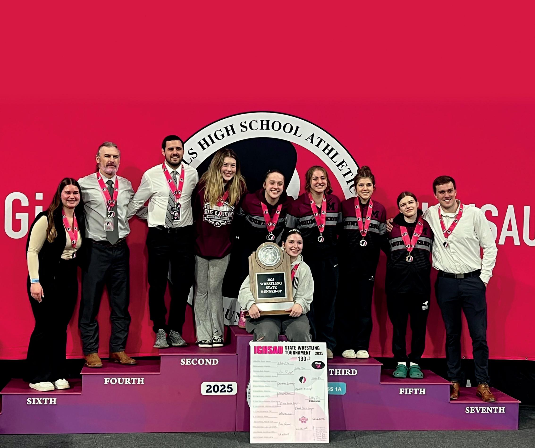 The Mount Vernon Mustangs girls’ wrestling team finished as the state runner-up in the girls’ wrestling state tournament Thursday, Feb. 6 and Friday, Feb. 7 at XTream Arena in Coralville. Libby Dix again took the crown at the 190-