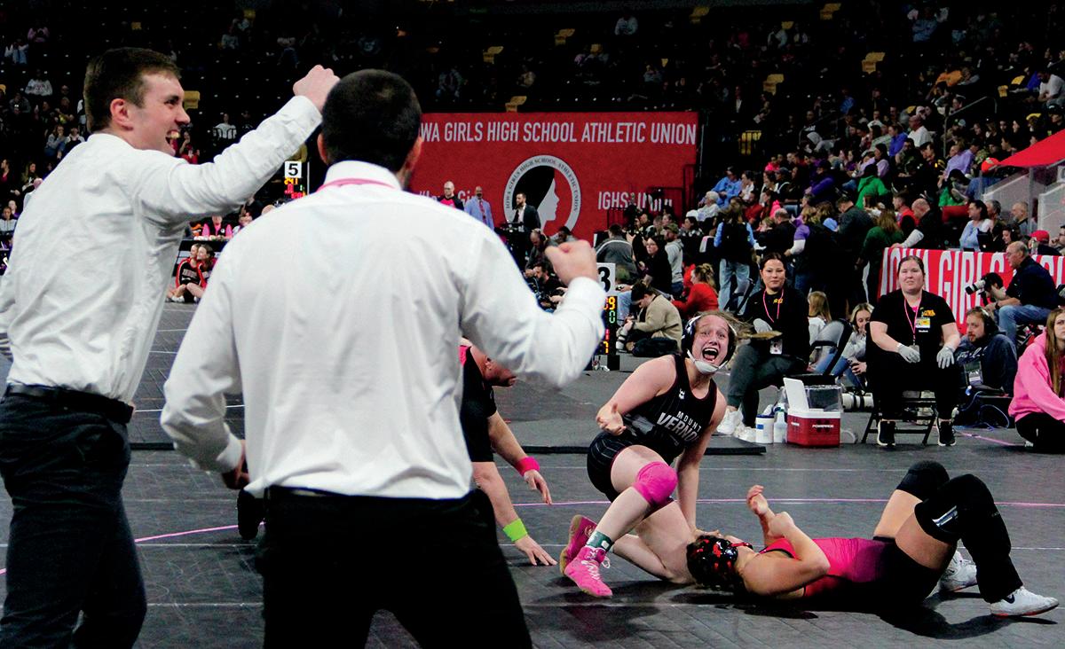 Middle left: Mount Vernon’s Kiersten Swart wrestles at the girls’ state wrestling tournament in Coralville. Bottom right: Mount Vernon’s Kate Martin celebrates at the conclusion of a match at the girls’ state wrestling tournament in Coralville.