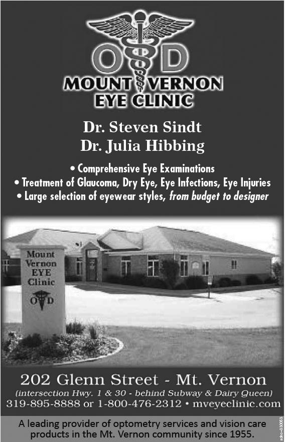 The eye clinic is located at 202 Glenn Street in Mount Vernon. Dr. Steven Sindt and Dr. Julia Hibbing’s expert eye care includes comprehensive eye care, treatment of glaucoma, eye infections, injuries, foreign body removal and all types of contact lens fittings. Their team includes Tammy Dunston, Sheryl Dohmen, Lisa Yakish, Erica McConaughy and Shannon Studt.