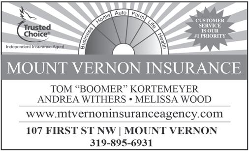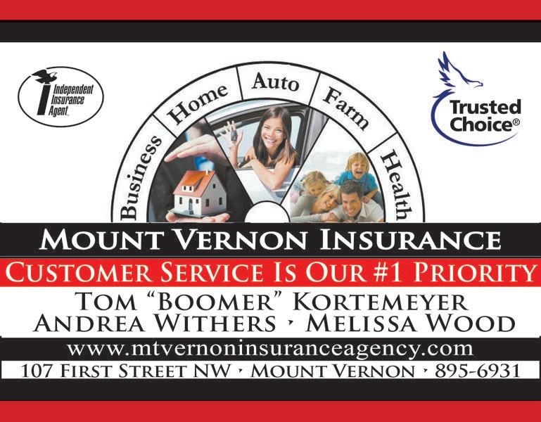 Mount Vernon Insurance has been your hometown insurance agency serving the Mount Vernon and Lisbon area for more than 30 years. Mount Vernon Insurance is an Independent Trusted Choice Agency that has many different companies to work with. This gives agents several options to meet their customers’ insurance needs, whether it be personal, commercial, farm or health. They work for you, not an insurance company. Pictured are agents Melissa Wood and Andrea Withers with owner Tom “Boomer” Kortemeyer.