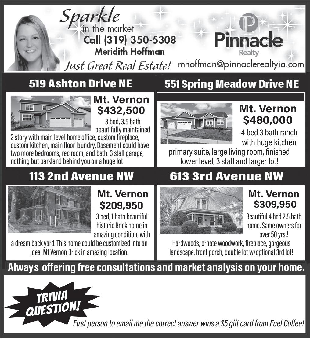 Room E131, Iowa City, Iowa 52242. Periodicals Postage Paid at the Mount Vernon Post Office and additional offices. POSTMASTER: Send address changes to Mount Vernon-Lisbon Sun, 108 1st St SW, Mount Vernon, IA 52314. Subscriptions: Contact Rochelle Ferguson at 319-895-6216 or rochelle.ferguson@mvlsun.com for additional information. Subscription rates: Linn and adjoining counties – $55 annually; elsewhere in Iowa – $75 annually; out of state – $85 annually.