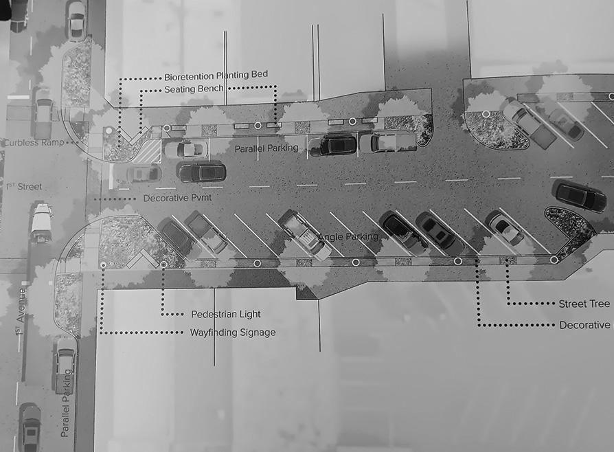 Kaemmer explained that the designers had put in bio retentions at corners and throughout the streetscape in areas where people may cross the roads. Those serve two purposes – trying to retain some of the water that flows during a storm and keeping motorist mindful of people possibly crossing near these areas. Bump outs in the middle of the blocks, like at Hilltop Park and the north alley along West First Street also serve as a spot to slow the traffic down.