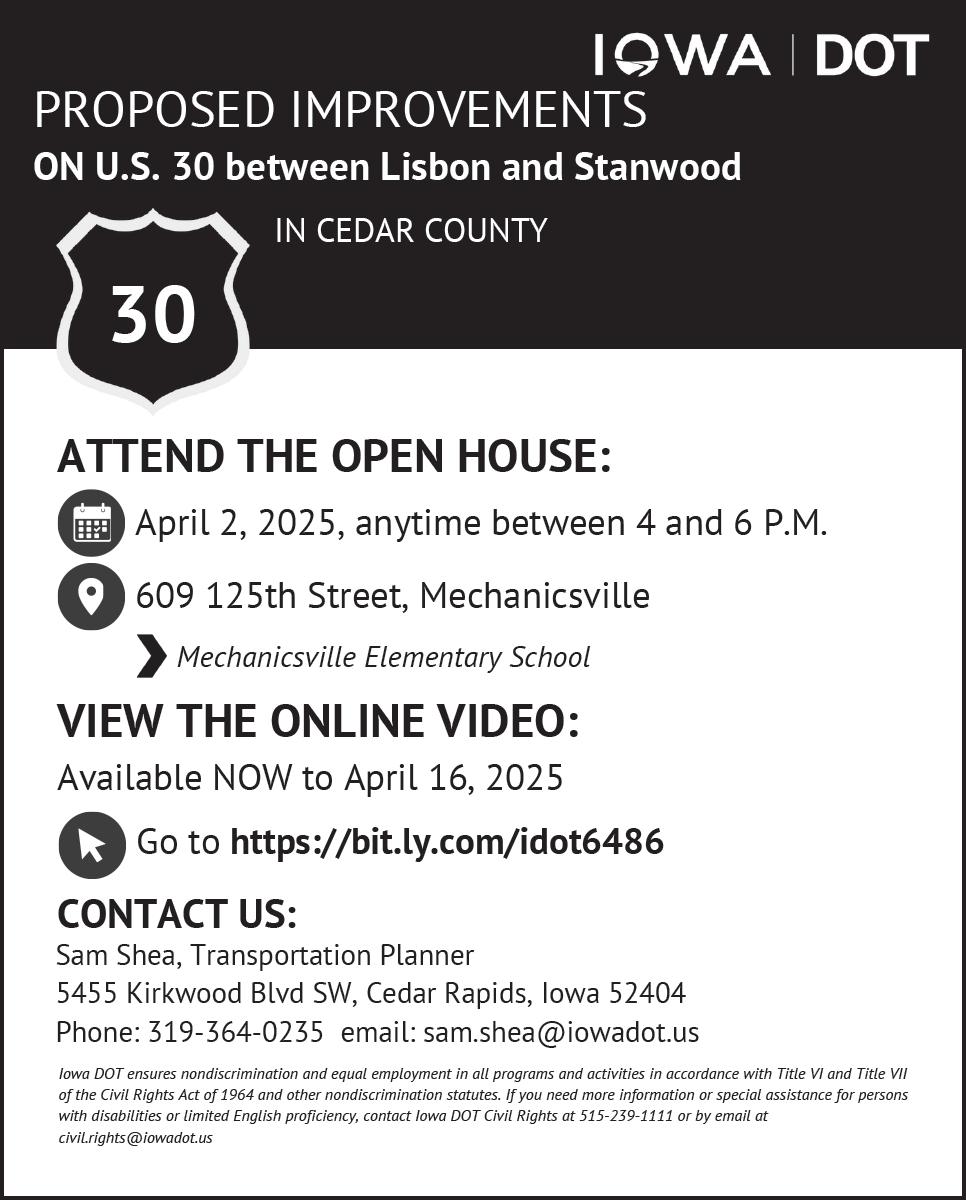 The Iowa Department of Transportation will be holding an open house on proposed improvements to Highway 30 Wednesday, April 2 from 4 to 6 p.m.