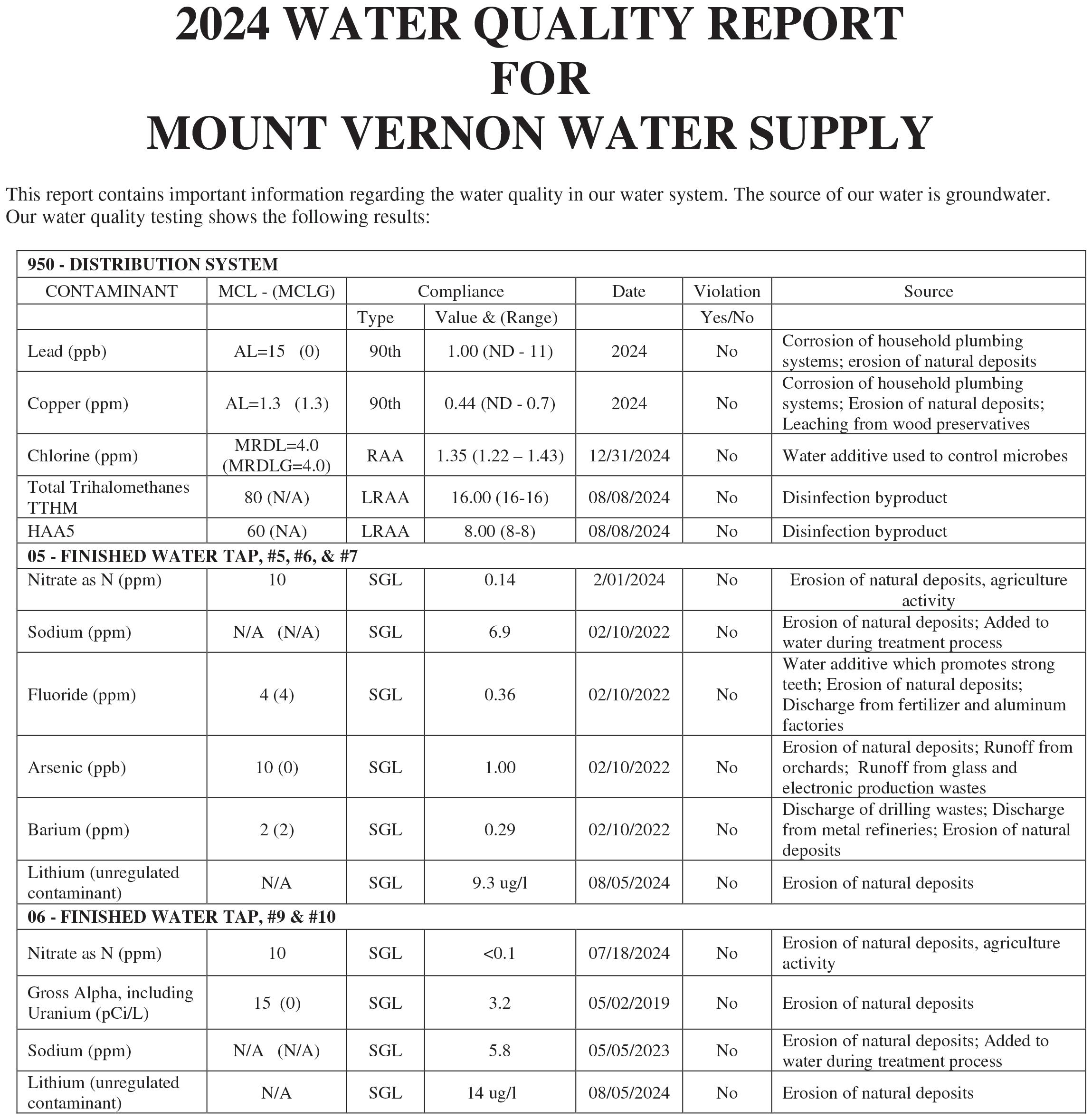Department of Natural Resources, and is available from the Water Operator at 319270-0459. This water supply obtains its water from the sandstone and dolomite of the Cambrian-Ordovician aquifer. The Cambrian-Ordovician aquifer was determined to have low susceptibility to contamination because the characteristics of the aquifer and overlying materials provide natural protection from contaminants at the land surface. The Cambrian-Ordovician well will have low susceptibility to surface contaminants such as leaking underground storage tanks, contaminant spills, and excess fertilizer application. A detailed evaluation of your source water was completed by the Iowa Department of Natural Resources, and is available from the Water Operator at 319-207-0459. CONTACT INFORMATION For questions regarding this information, please contact Alex Volkov, Water/ Waste Water Superintendent at 319-2700459 Monday through Friday during the following hours: 7am to 4pm. Decisions regarding the water system are made at the City Council meetings held on the first and third Mondays of the month at 6:30pm at City Hall and are open to the public. This report will not be mailed out to customers, but is available to view on the City website at www.cityofmtvernonia. gov or at City Hall. Published in the Sun March 27, 2025.