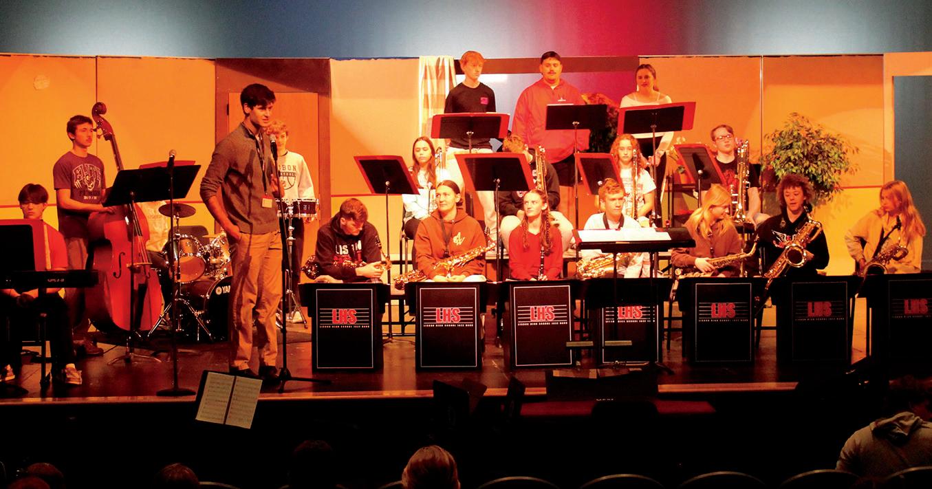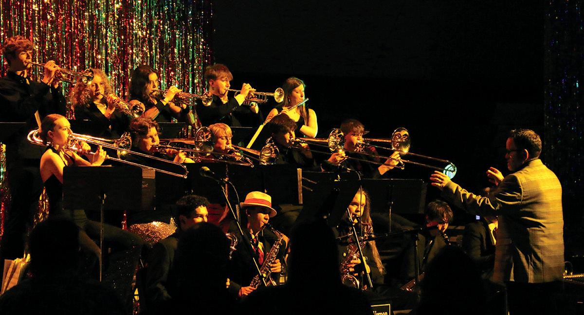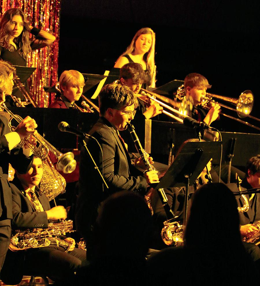 Top: The Mount Vernon Jazz Band, directed by Scott Weber, performed a Java Jazz event at Mount Vernon High School on Monday, April 14, 2025. The concert featured music by jazz legends such as Ray Charles and B.B. King. Above:: William Turner plays the saxophone during the Java Jazz event at Mount Vernon High School on Monday, April 14, 2025. He performed with the Mount Vernon Jazz Band on “Goin’ Down” by The Monkees and “From the Start” by Laufey.