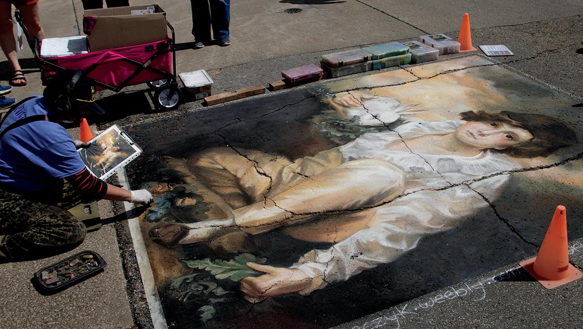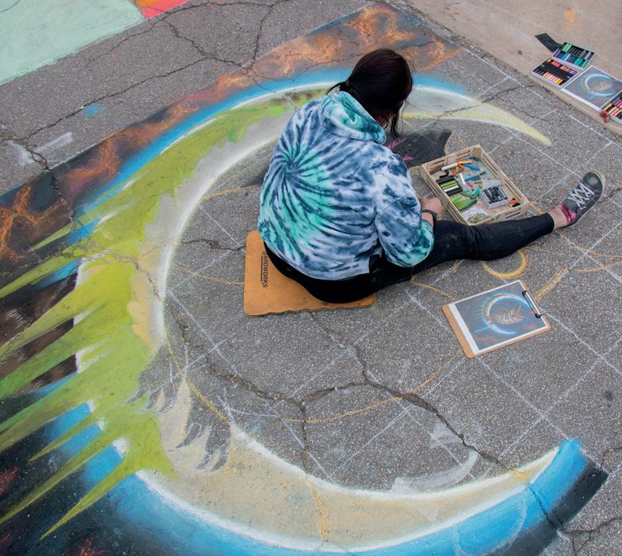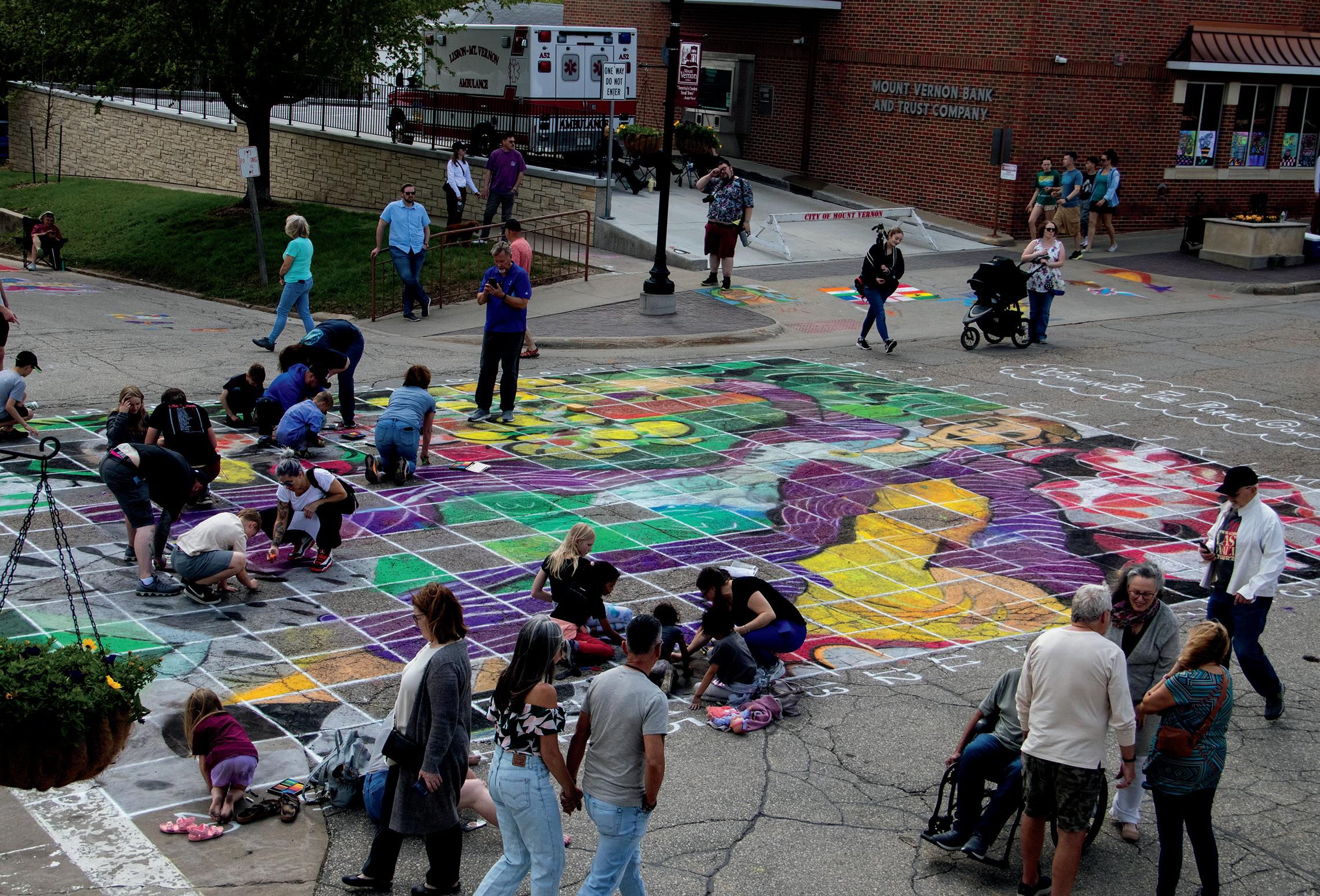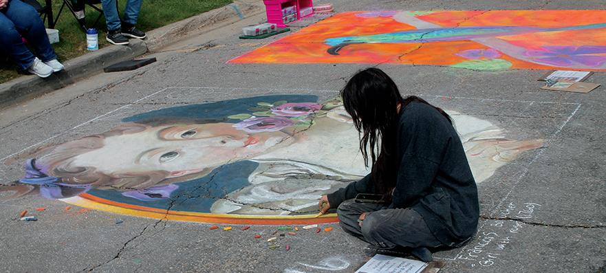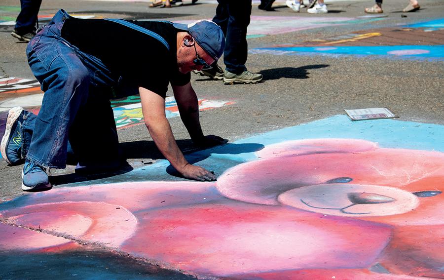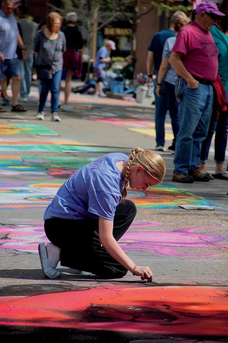 Top: Elizabeth Niemczyk puts final touches on her people’s choice and second place piece at Chalk the Walk. Above: Casey Kasperek touches up his third place winning teddy bear drawing at Chalk the Walk Sunday, May 4. Left: Chalkers work at finishing the community art piece Sunday, May 4 in uptown Mount Vernon.