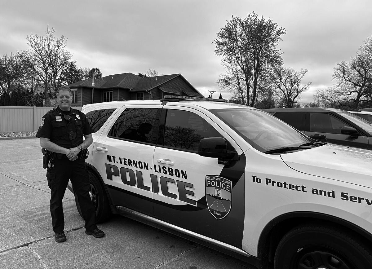 Mount Vernon-Lisbon Police Chief Doug Shannon poses for a portrait next to one of the department’s squad cars. Parts of Shannon’s daily duties include patrolling the jurisdiction and waving to whoever passes by.