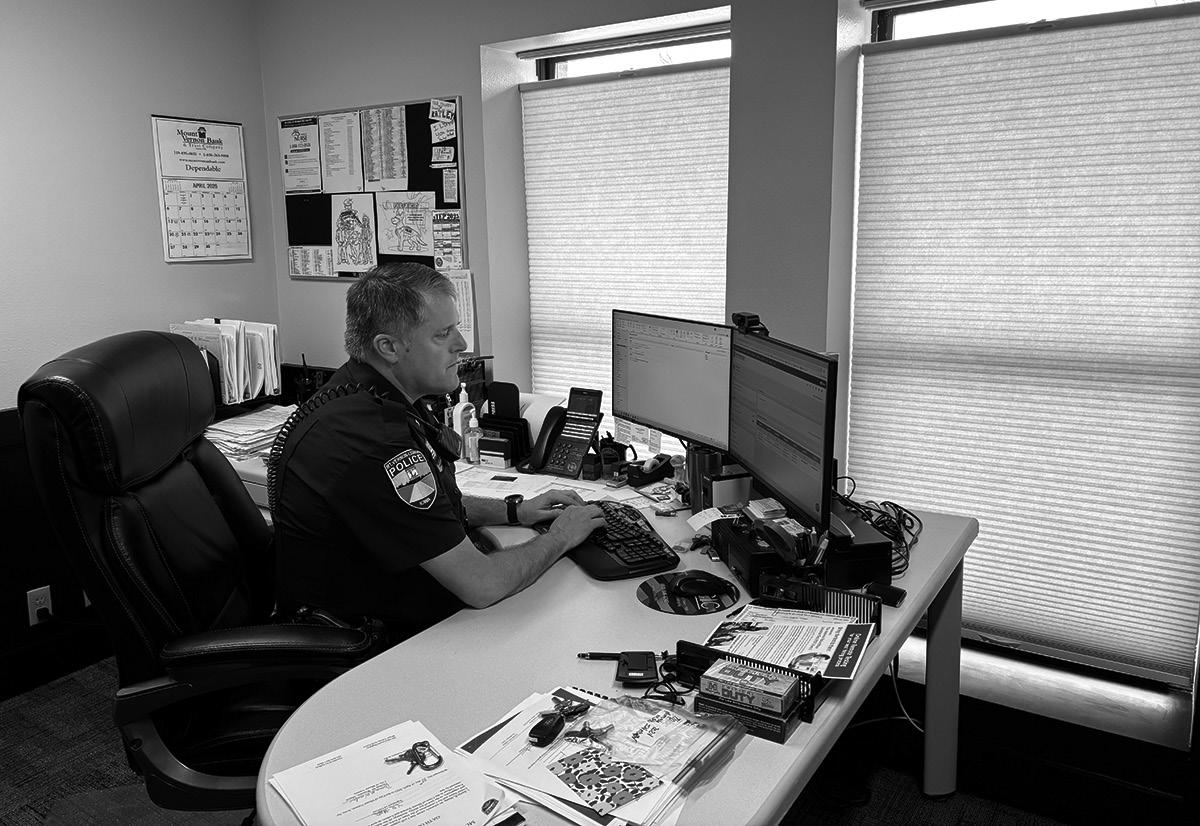 Mount Vernon-Lisbon Police Chief Doug Shannon works at the computer in his office between patrol. Even while on call, Shannon coordinates community outreach and policing with the people around him.