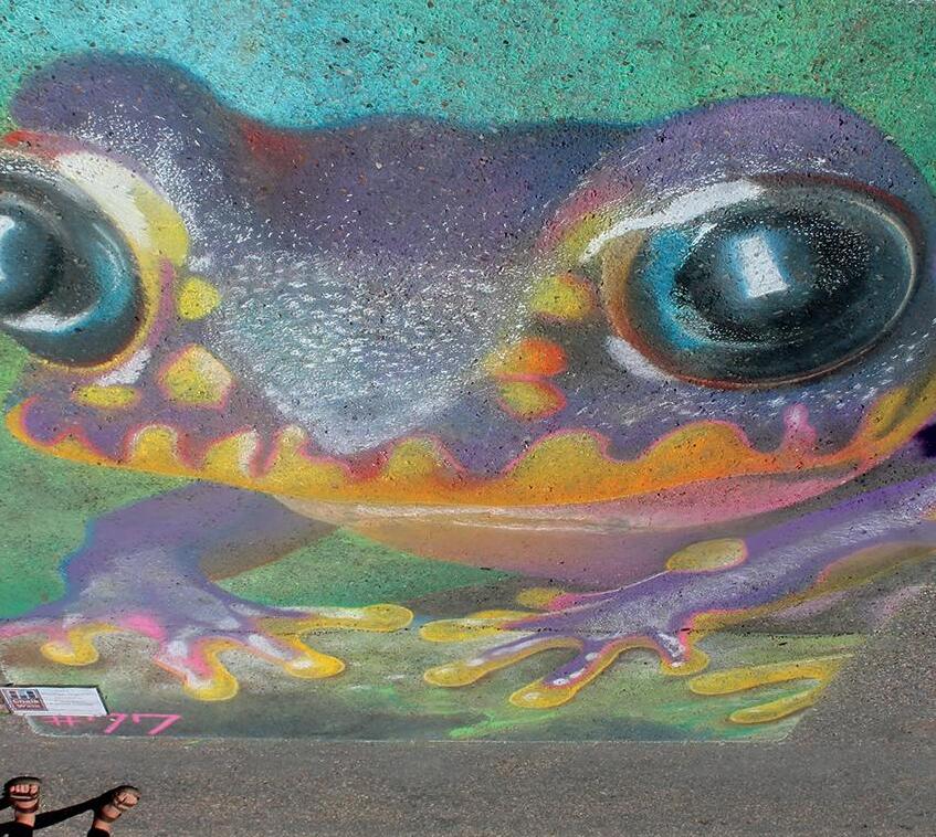 Left: Autumn Zaehringer works on her first-place piece at Chalk the Walk. Right: Hannah Dighton’s second place winning colorful frog.