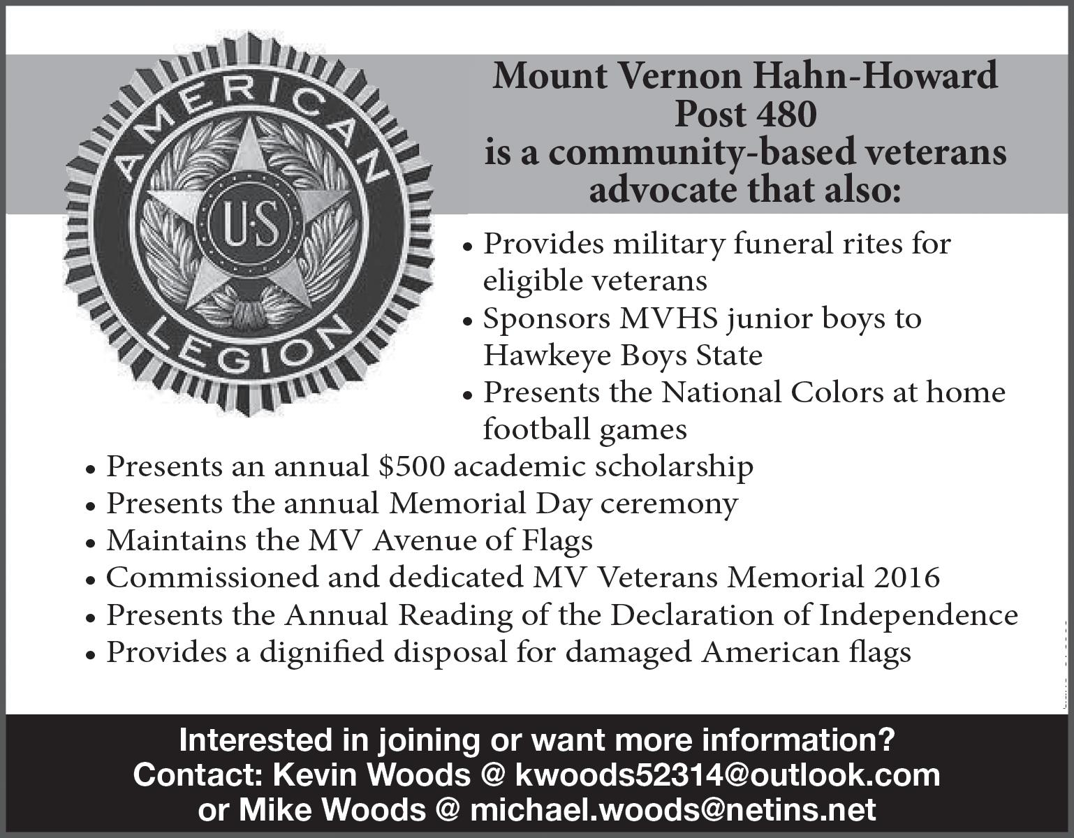 The mission of the post is several fold – ensure veterans are buried with military honors, ensure Memorial Day and Veterans Day are observed in the community; grant a scholarship to at least one civic minded high school senior each year; maintain the Veterans Memorial at the Mount Vernon Cemetery with time and money and provide a dignified disposal of American flags.