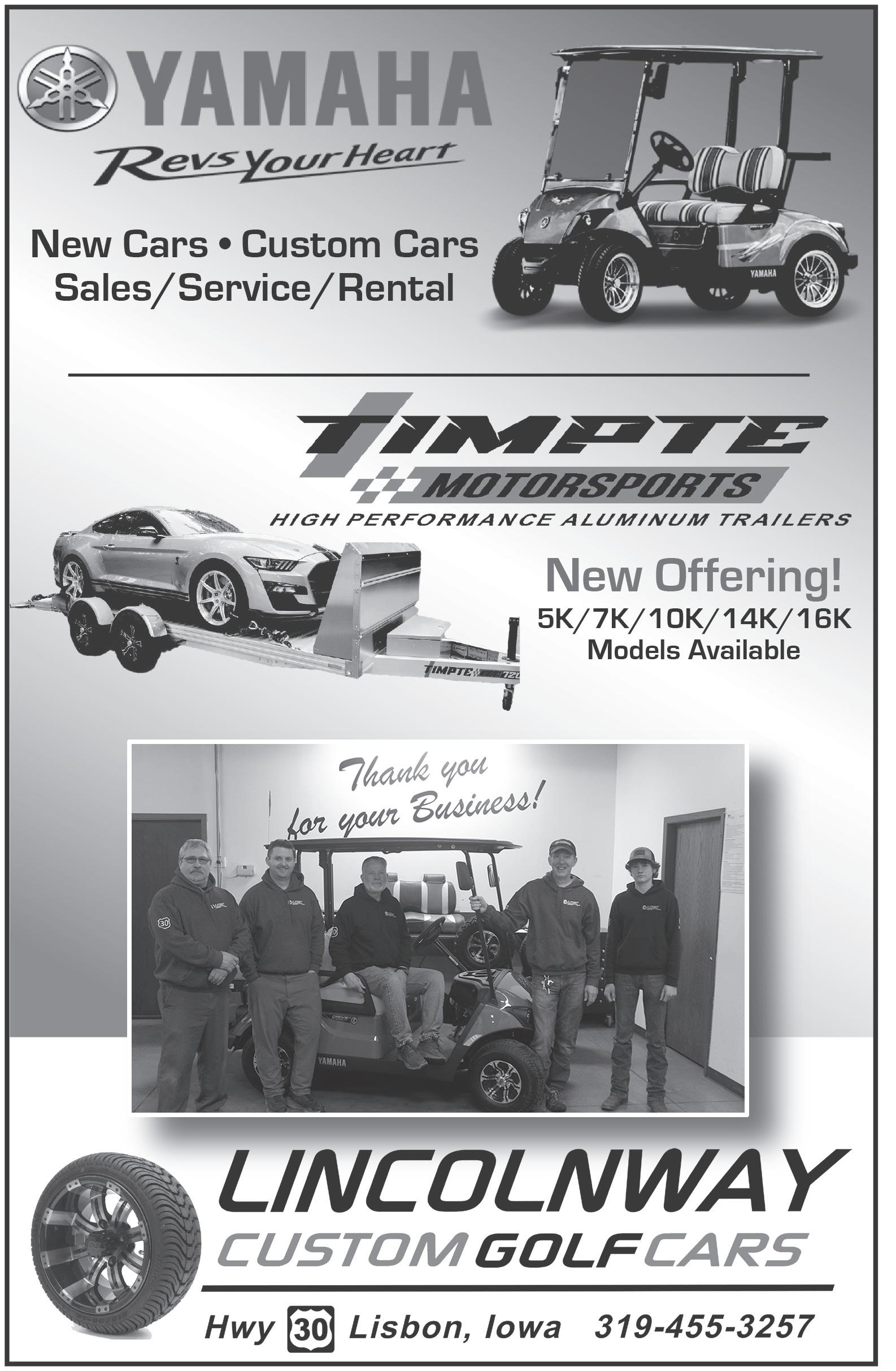Stay updated on our latest inventory, promotions, and special events by following us on Facebook and Instagram. Better yet, stop by and see us in person at our showroom at 943 W. Business 30, Lisbon, Iowa 52253 or call (319) 455-3257 www.lincolnwaygolfcars.com
