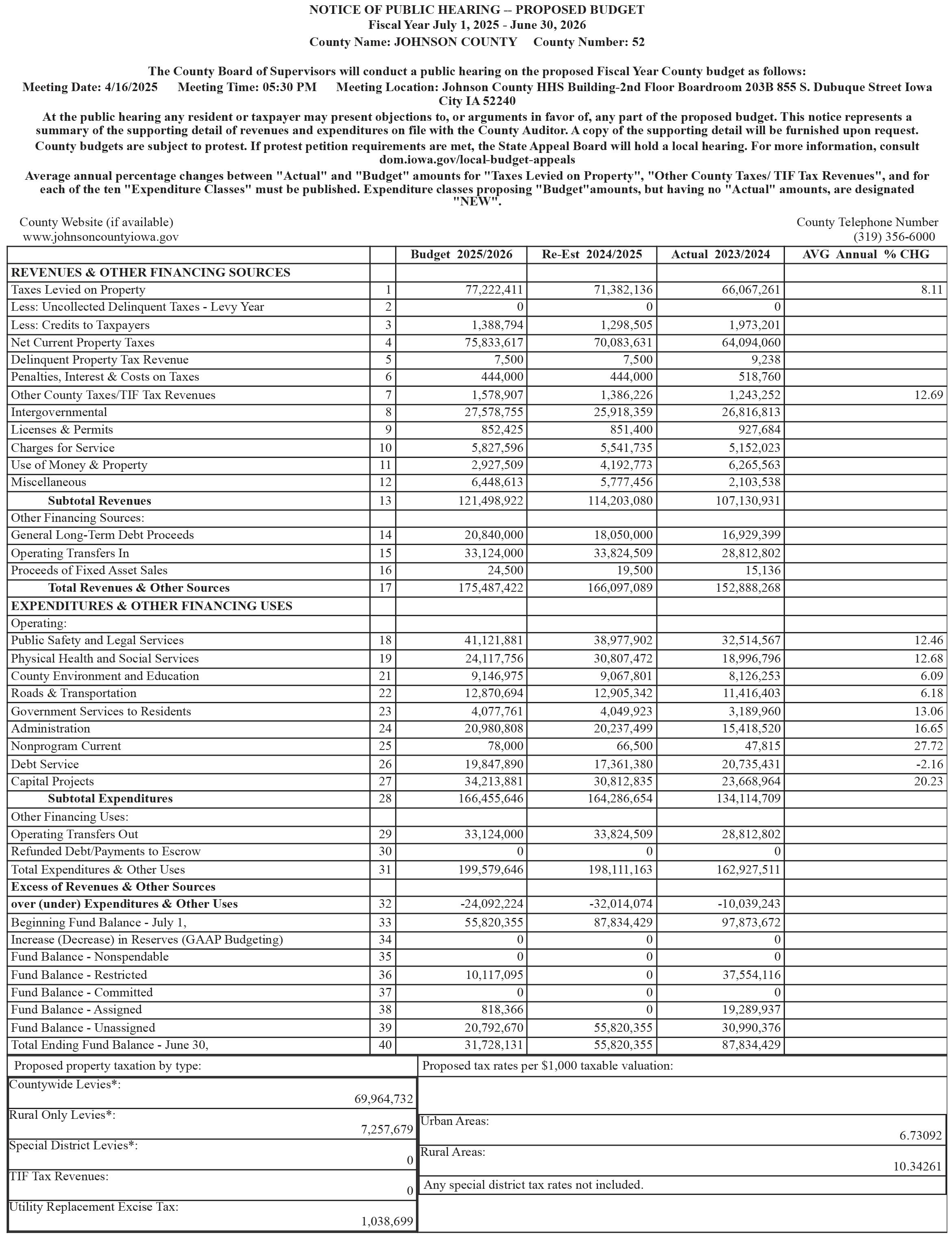 NOTICE OF PUBLIC HEARING ON LOAN AGREEMENT IN A PRINCIPAL AMOUNT NOT TO EXCEED $200,000 (GENERAL OBLIGATION COUNTY FARM BUILDING RENOVATIONS AND IMPROVEMENTS) The Board of Supervisors of Johnson County, Iowa, will meet on April 16, 2025, at the Johnson County Health and Human Services Building, Iowa City, Iowa, at 5:30 p.m. for the purpose of instituting proceedings and taking action to enter into a loan agreement (the “County Farm Building Renovations and Improvements Loan Agreement”) in a principal amount not to exceed $200,000, for the purpose of paying costs, to that extent, of remodeling, reconstructing, and equipping the County Farm historic site and grounds thereof. The County Farm Building Renovations