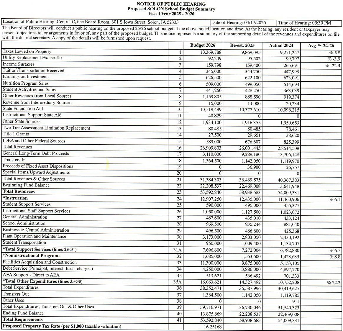SOLON — Part of the months-long process of crafting an annual budget for the Solon Community School District (SCSD) involves setting the property tax rate (levy), a set amount per $1,000 of taxable valuation.