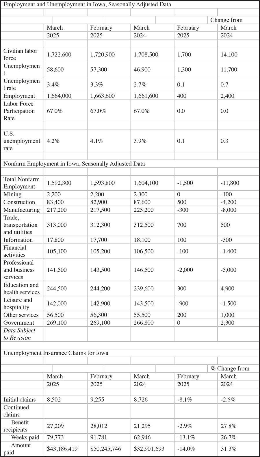 DES MOINES — Iowa’s labor force participation rate held steady at 67.0 percent in March as 1,700 Iowans entered the labor force. The state’s seasonally adjusted unemployment rate was 3.4 percent in March, up slightly from 3.3 percent in February. Meanwhile, the U.S. unemployment rate increased to 4.2 percent in March.