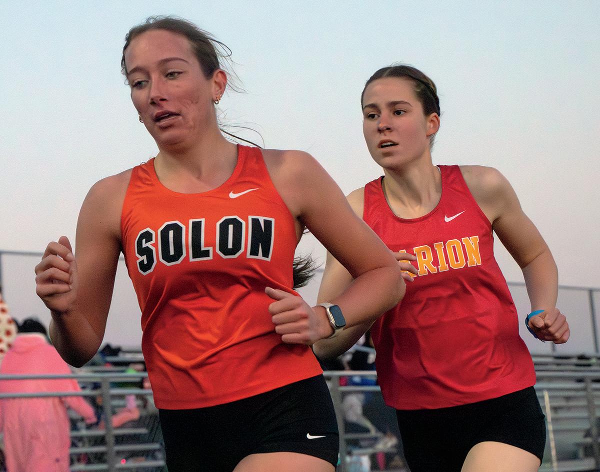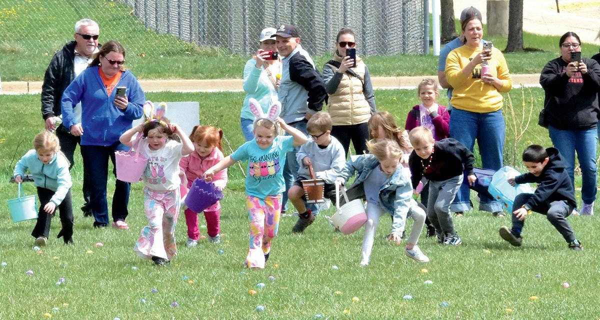 Front page: A group of kids hustles to gather plastic eggs full of candy during the Solon Optimist Club’s annual Easter Egg Hunt this past Saturday at the SRNA. 3,456 eggs were gathered within three minutes by 117 children.