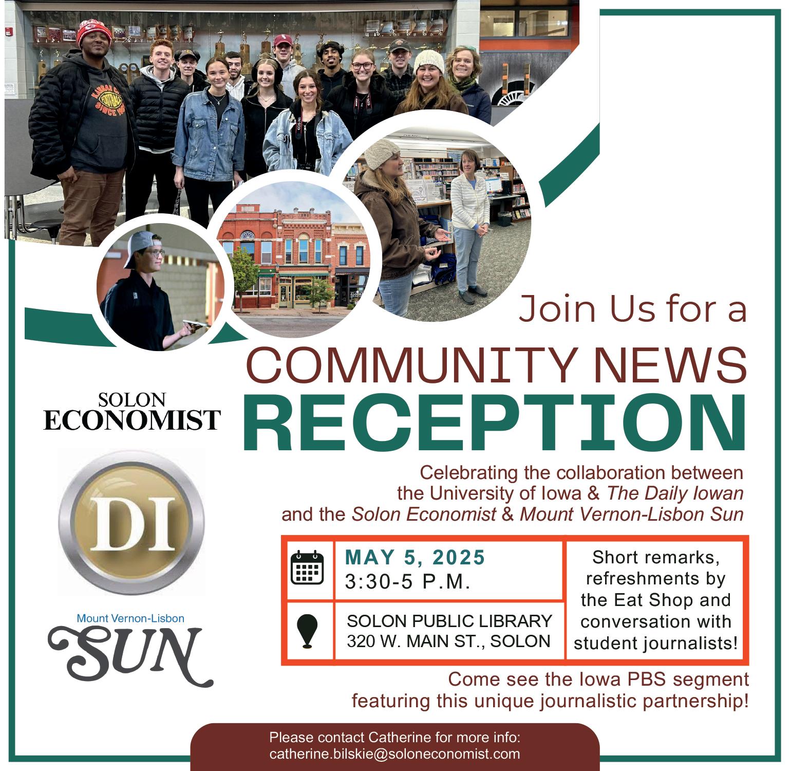Monday, May 5, the UI’s Community News Class is hosting a reception at the Solon Public Library (320 W. Main St.), from 3-5 p.m., to celebrate the collaboration between the university, The Daily Iowan , the Solon Economist , and the Mount Vernon-Lisbon Sun.