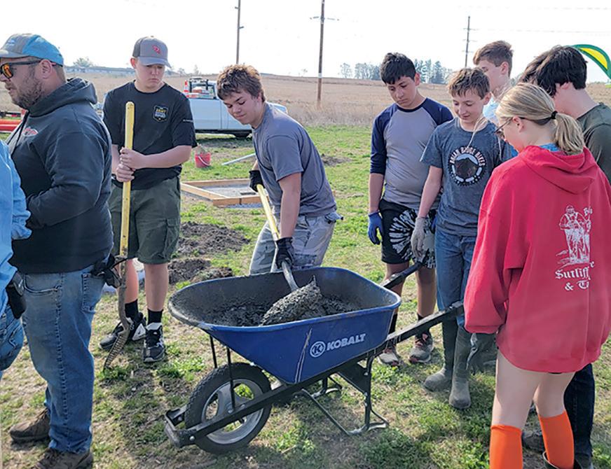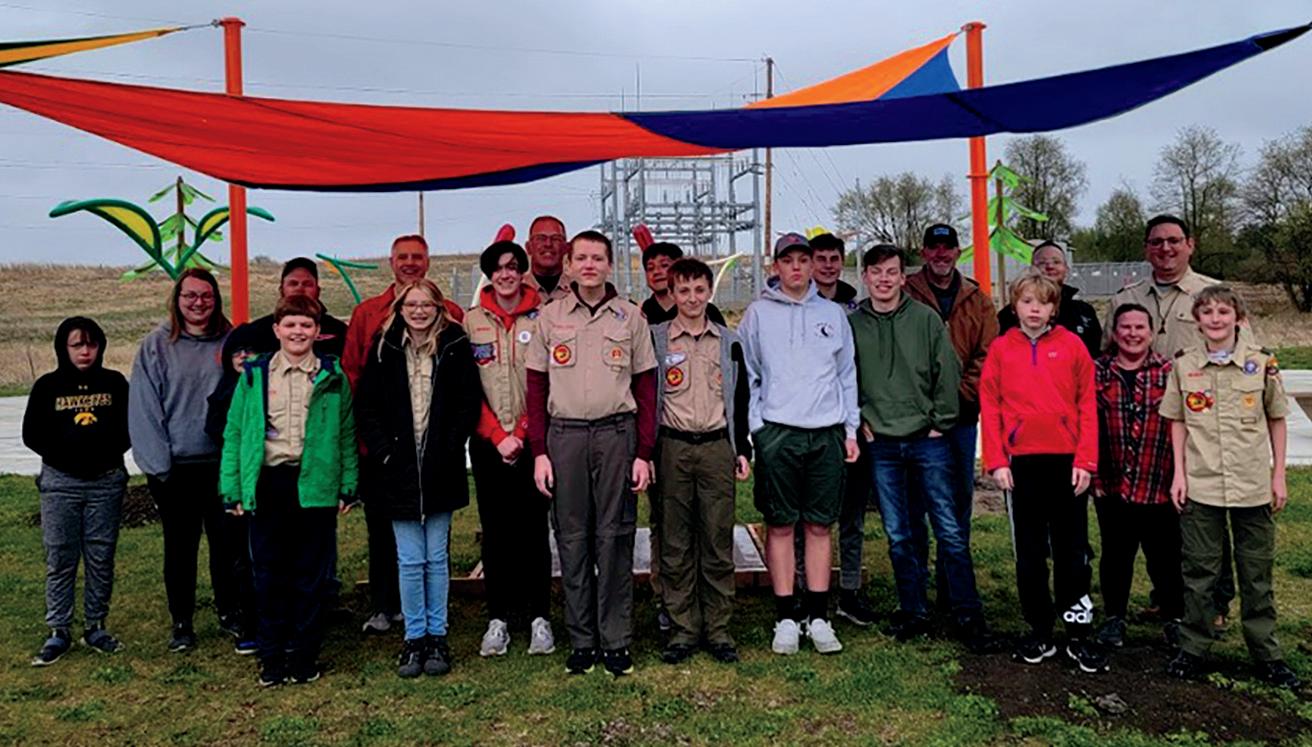 Assistant Scoutmaster, is on the Solon HS archery team, a member of Solon Robotics, and does set construction for Solon’s drama and fine arts productions. Right and below: Jayden Merrick (front, center) led 41 people in his Eagle Scout Service Project to erect a sunshade canopy at the SRNA’s splash pad.