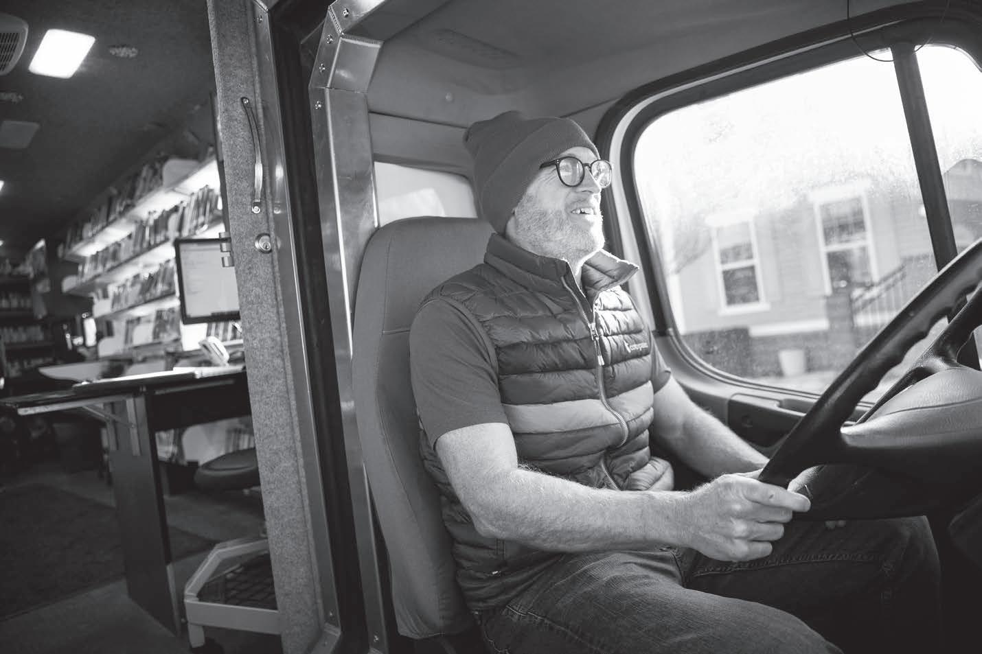 Since the Bookmobile’s reinstitution in 2017, Jordan has been on board. In his nine years of servicing the community, he has noticed how the variety of stops, regular schedule, and smaller scale collection and staff make an impact on those checking out books.