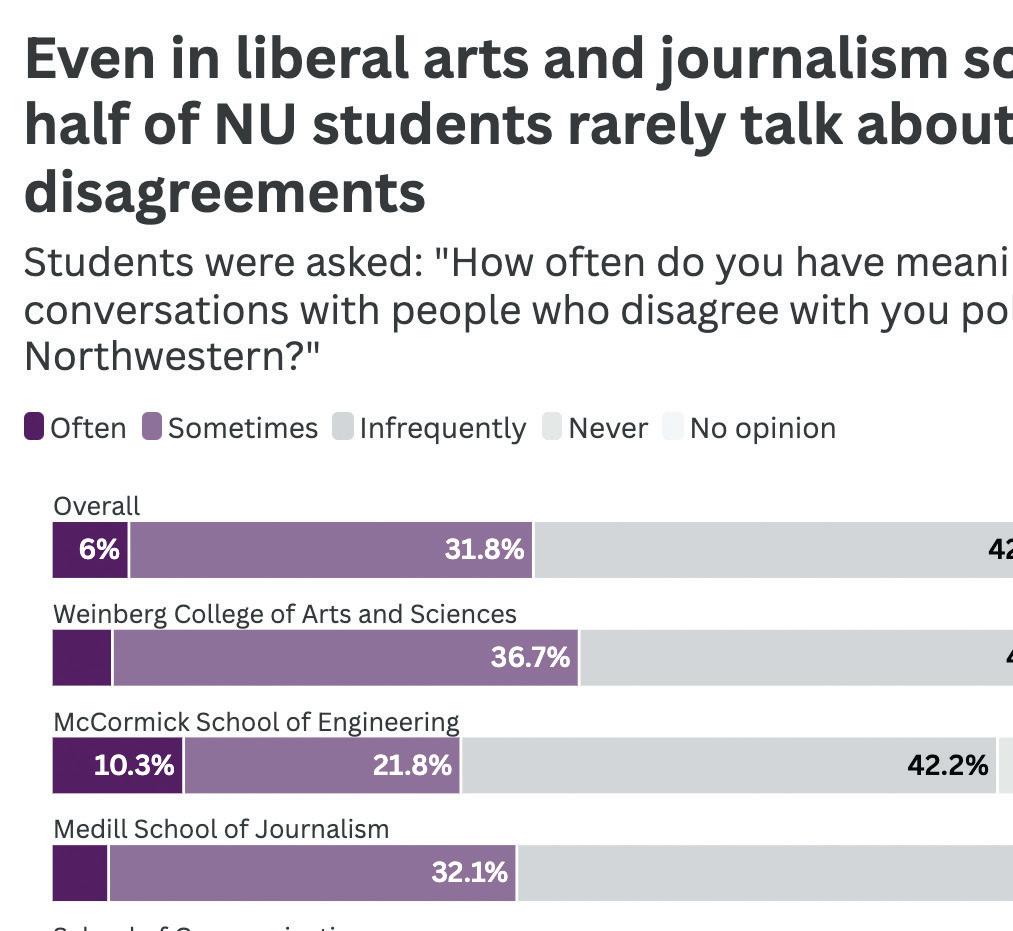 Even in Weinberg College of Arts and Sciences, NU’s liberal arts college, and Medill School of Journalism, students were more than twice as likely to say they never have conversations about political disagreements than to say they o en do.