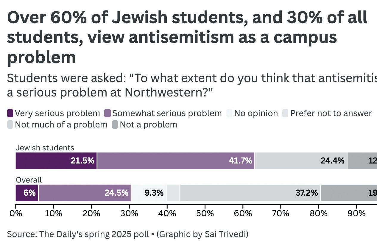 e majority of Jewish students identify antisemitism as a somewhat or very serious problem at NU (63.1%), joined by 30.4% of the whole student body. A smaller number of Jewish students say it is not much of a problem or not a problem (36.9%), along with a slight majority of the whole student body (56.7%).