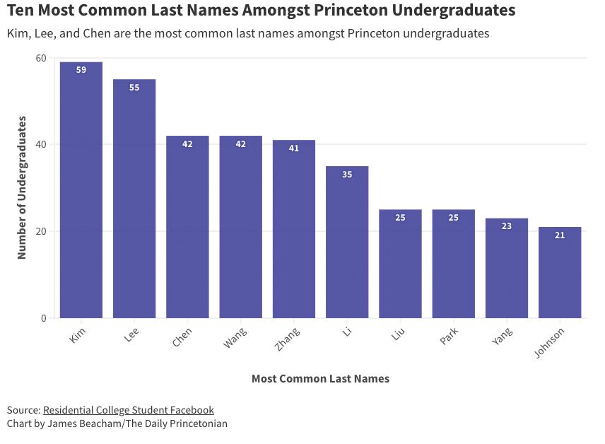 The ‘Prince’ found traditionally female names to have more variation than traditionally male ones. The top 10 traditionally female names account for only 4.54 percent of all names in the undergraduate student body, compared to traditionally male names at 6.09 percent. Certain surnames appear frequently among Princeton undergraduates. The top 10 last names account for 6.61 percent of undergraduates. Kim is the most common last name at Princeton with 59 undergraduates, or 1.13 percent, sharing the surname, meaning over one-ina-hundred undergraduate students share this last name.