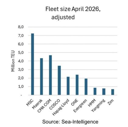 “MSC will grow their size advantage substantially compared to the second largest carrier – which i n c i d e n t a l l y w i l l b e C M A C G M , r e l e g a t i n g Maersk to be the world’s third largest carrier,” Sea-Intelligence stated in its latest weekly report looking at projected fleet sizes in April 2026. M S C