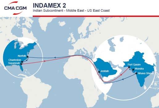 MUMBAI: CMA CGM has informed in a communique that in order to enhance its INDAMEX 2 service connecting Indian Subcontinent with US East Coast, anewcallatJeddah,SaudiArabiawillbeaddedtotherotation.